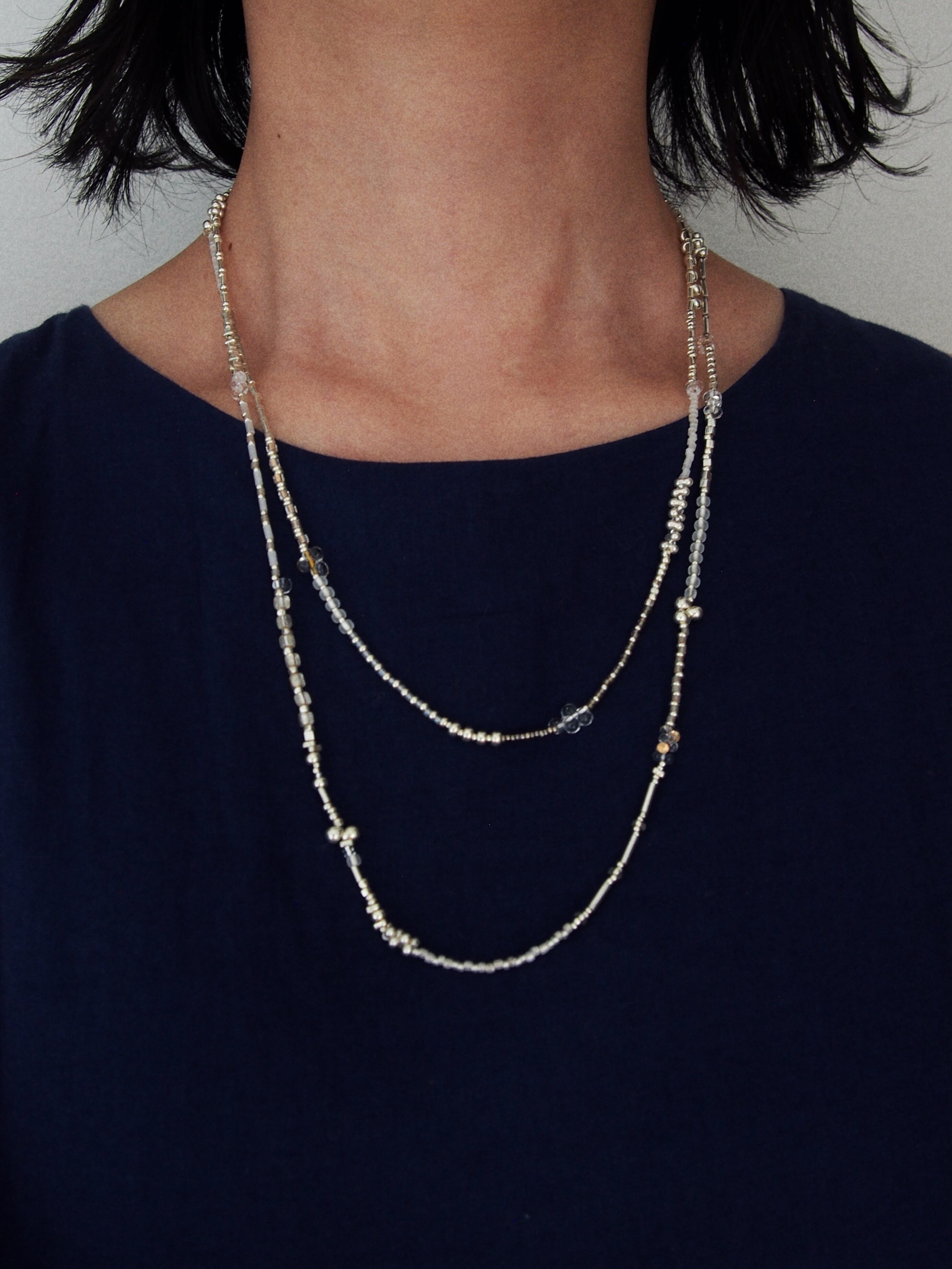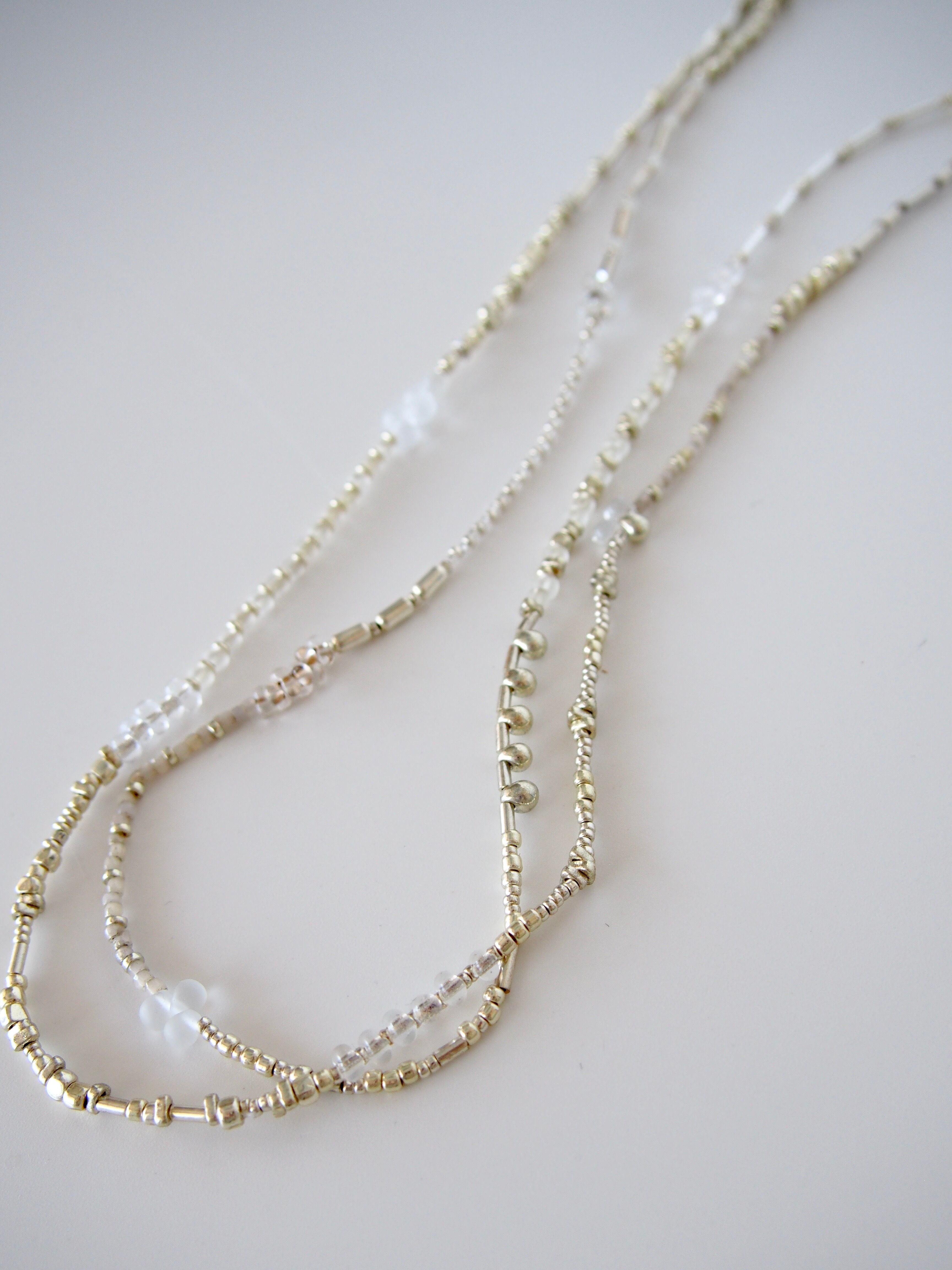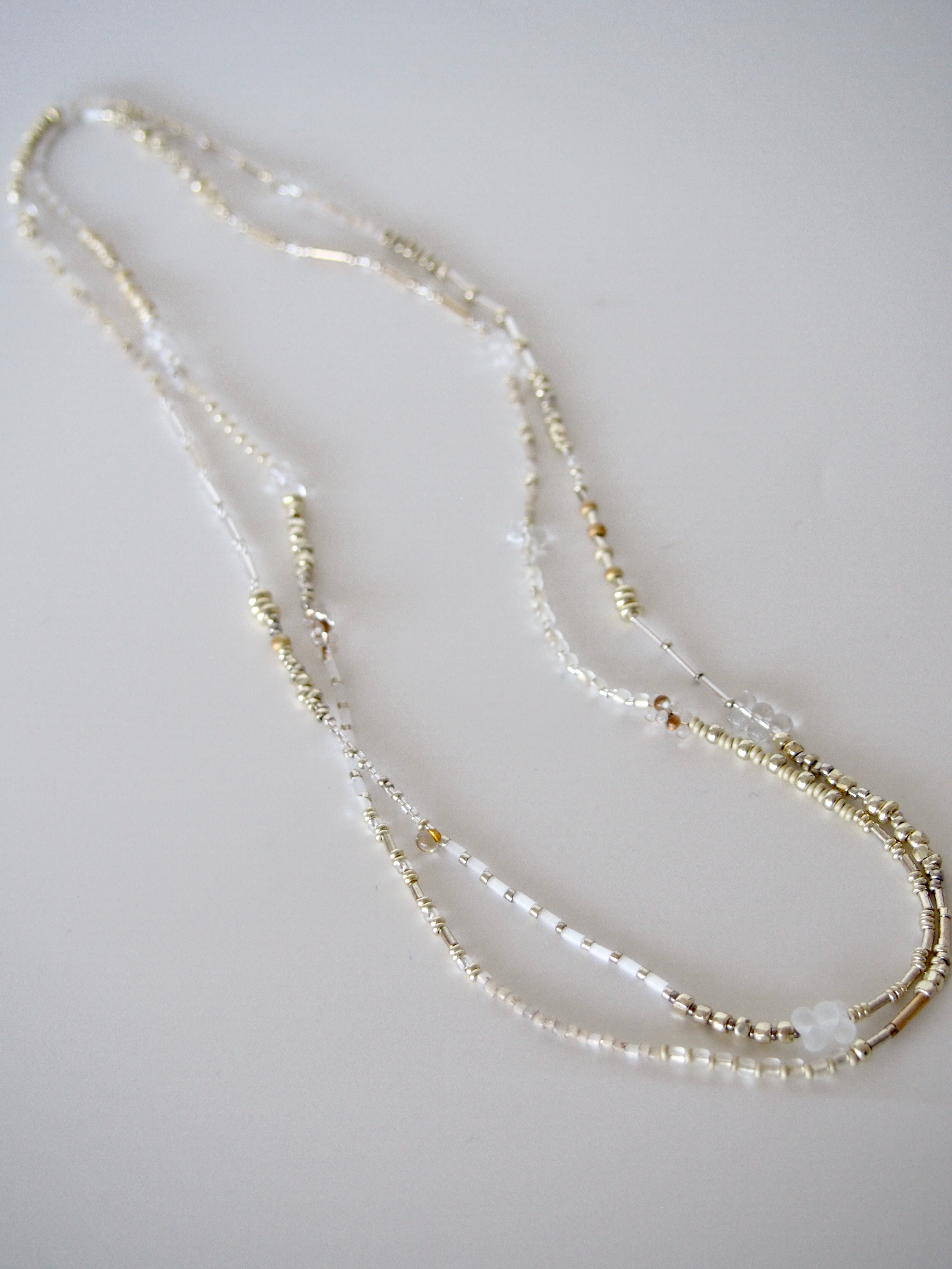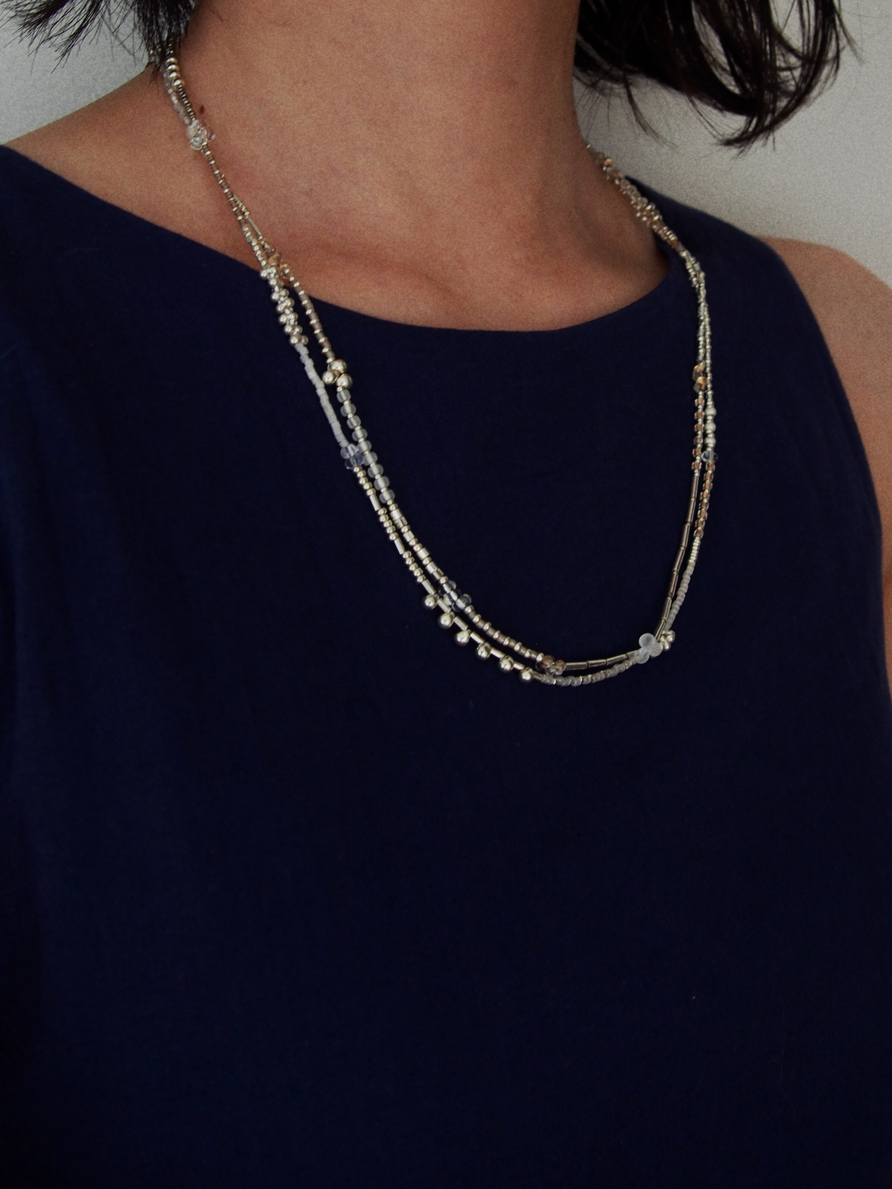 様々な表情の繊細なガラスビーズの暖かさを纏うシンプルな被るタイプのネックレス。
