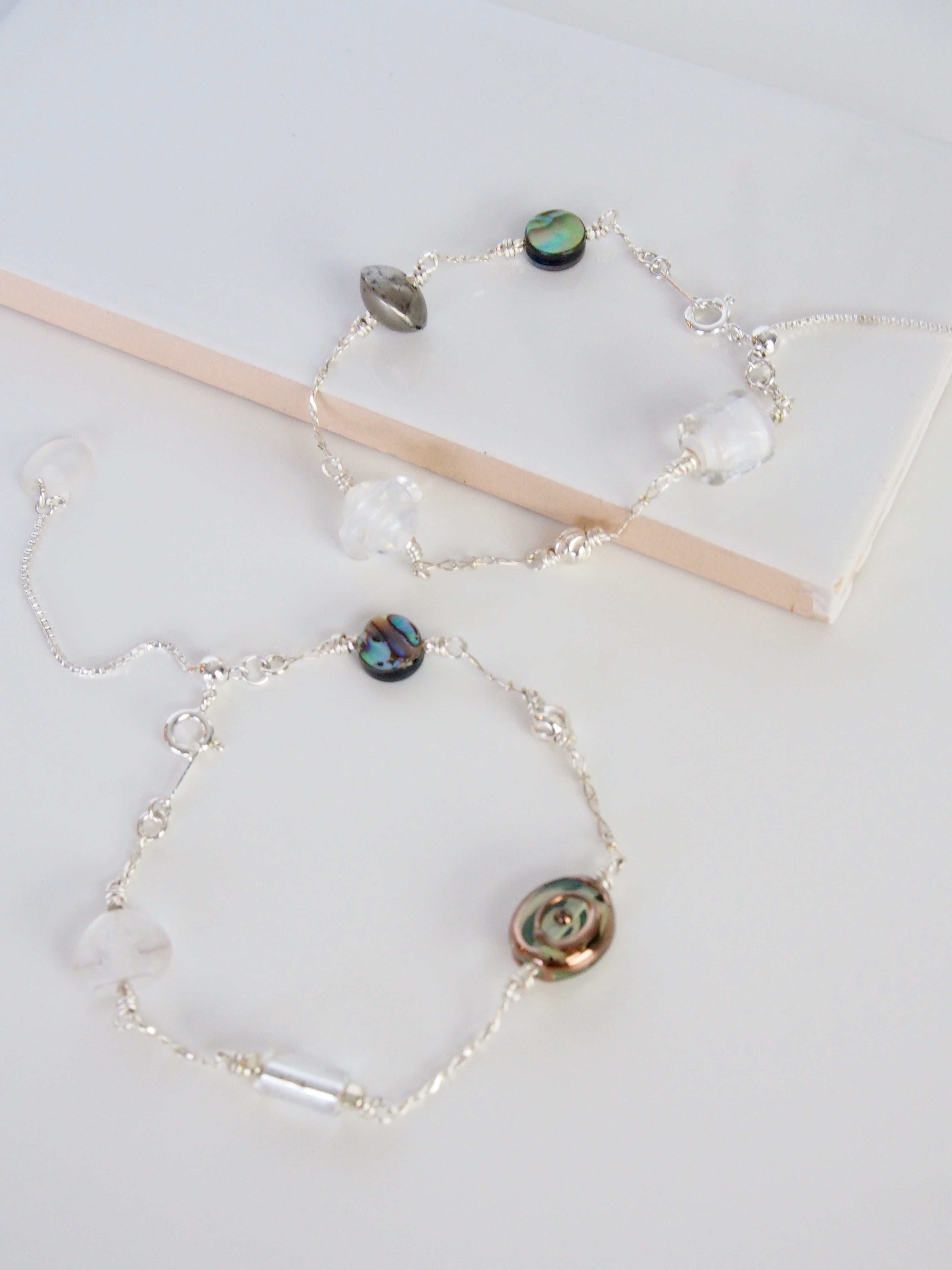 魅力的なガラスビーズとカレンシルバーパーツをシルバーチェーンにアソートに留めた、