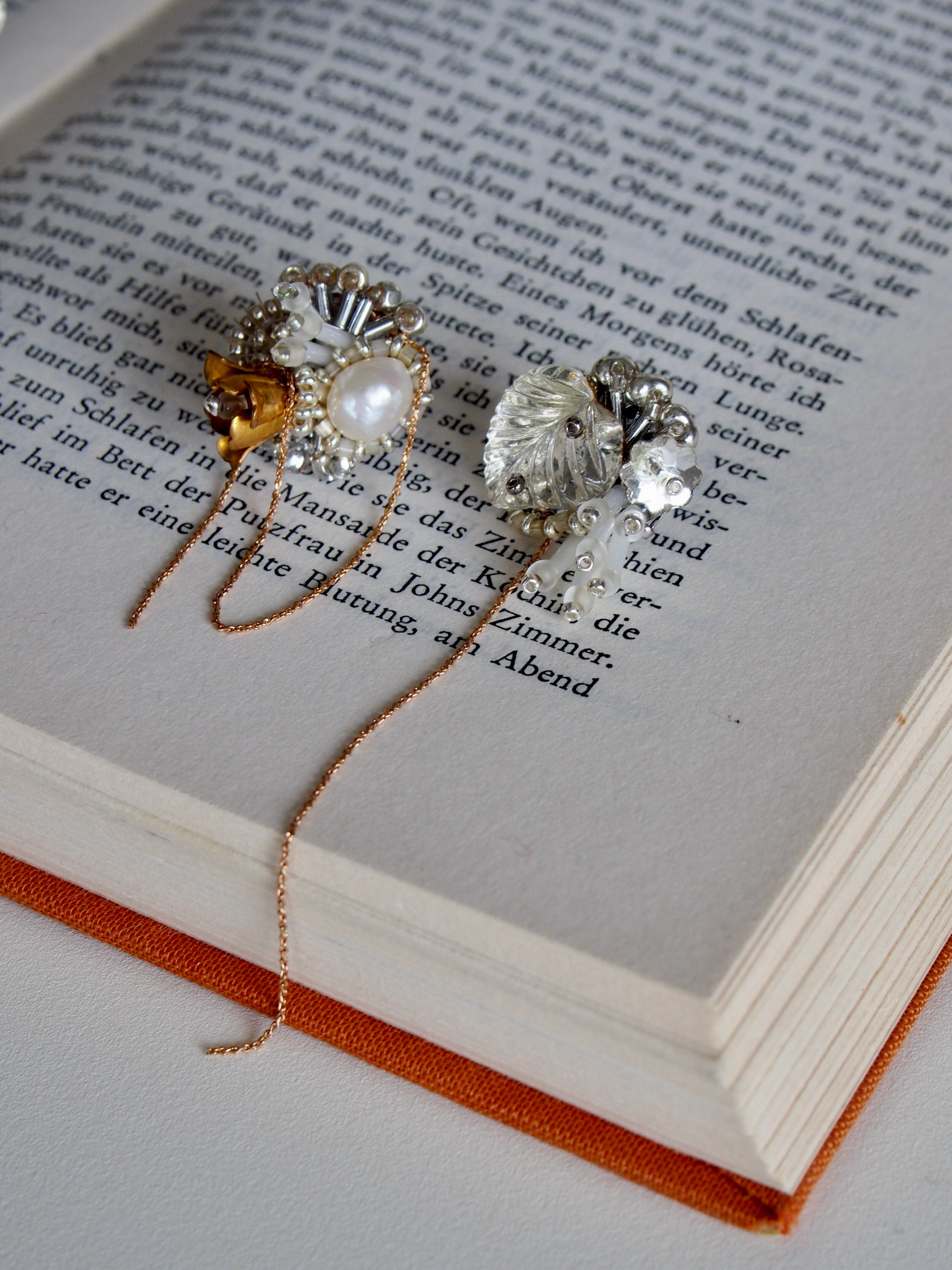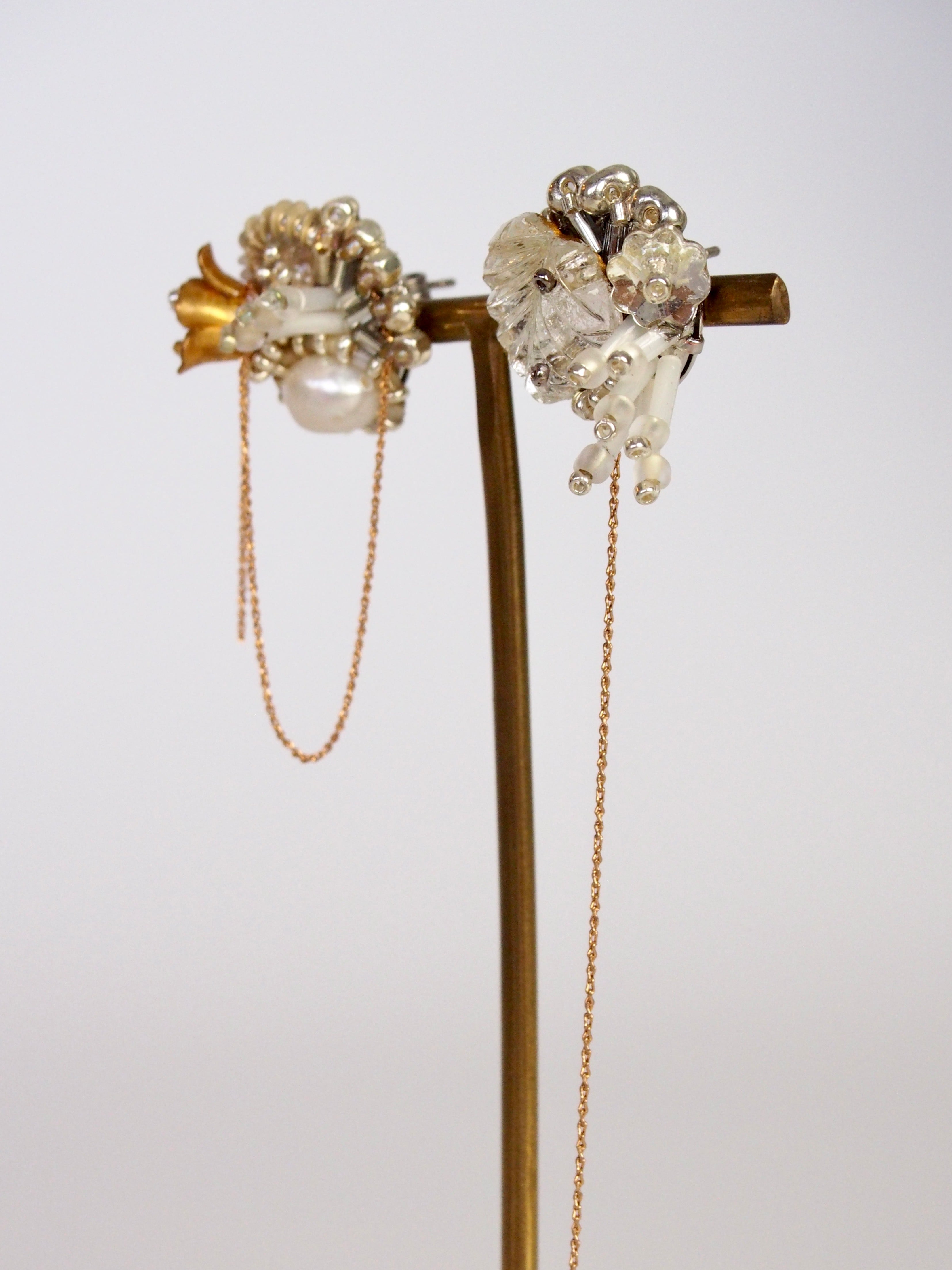 淡水パール・14KGFチェーン・ガラスカボション(German vintage)・ガラスビーズ(Japan vintage)・ガラスビーズ(Czech/ 1920's Czech Slovakia vintage)・スパンコール(France)・スワロフスキー(Austria)・真鍮(14KGP)・アクリル樹脂