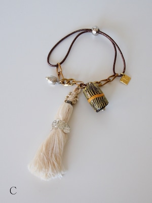 綿・ハンドメイドガラスビーズ(U.S.A/Venezia/Czech/Germany)・チェコビーズ (vintage)・メタルパーツ・ガラスビーズ(Japan)・アクリル樹脂・ウッドビーズ(U.S.A)・樹脂ビーズ・メタルパーツ(U.S.A)・ミックスメタル(Afghanistan)・真鍮ビーズ(India)・真鍮チェーン・真鍮チャーム(Lilyロゴ)・日本製ゴム