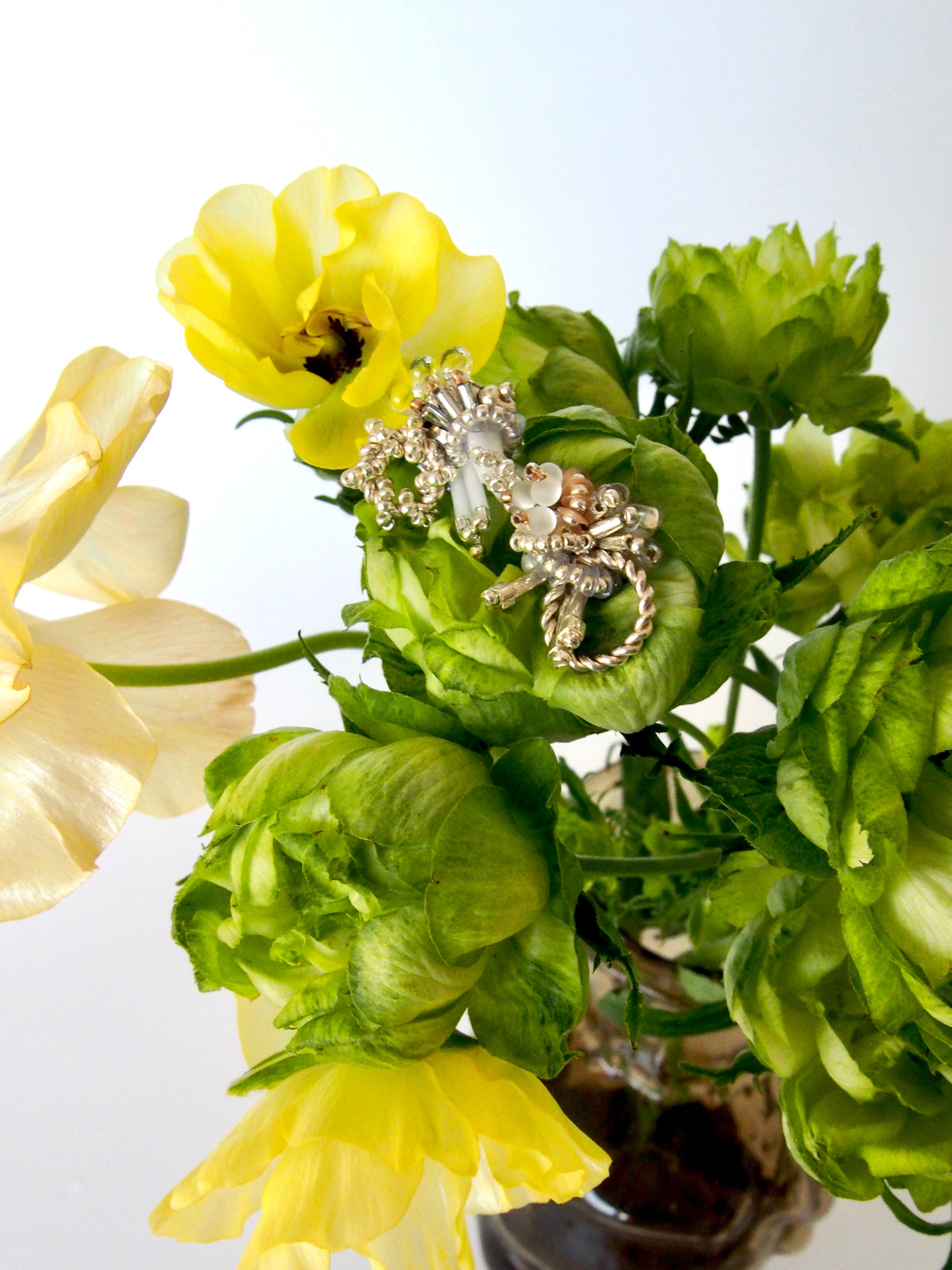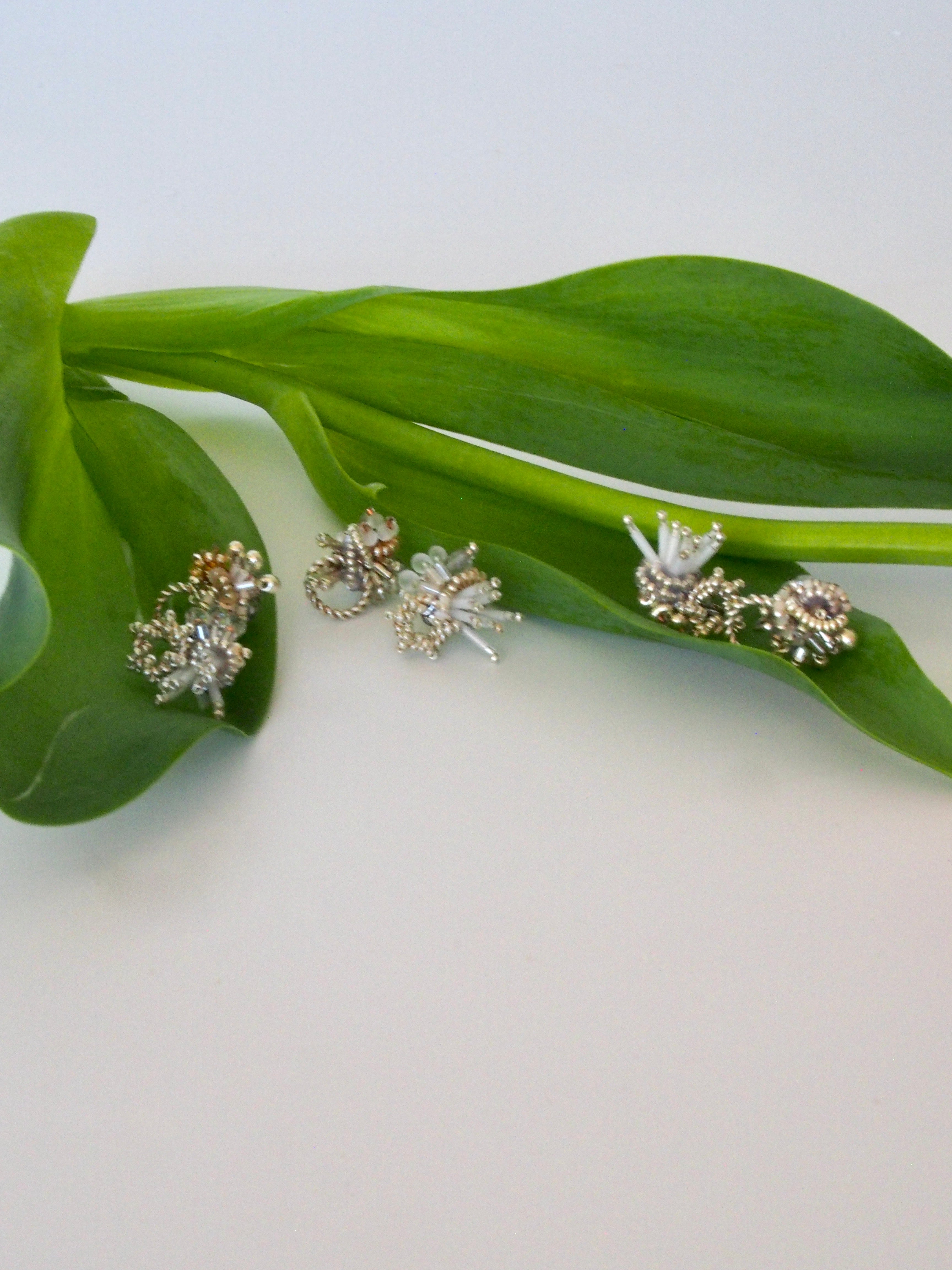 silver925 のフープパーツと、スパンコールなどの光を優しく含んでくれる素材を満遍なく編み込みました。