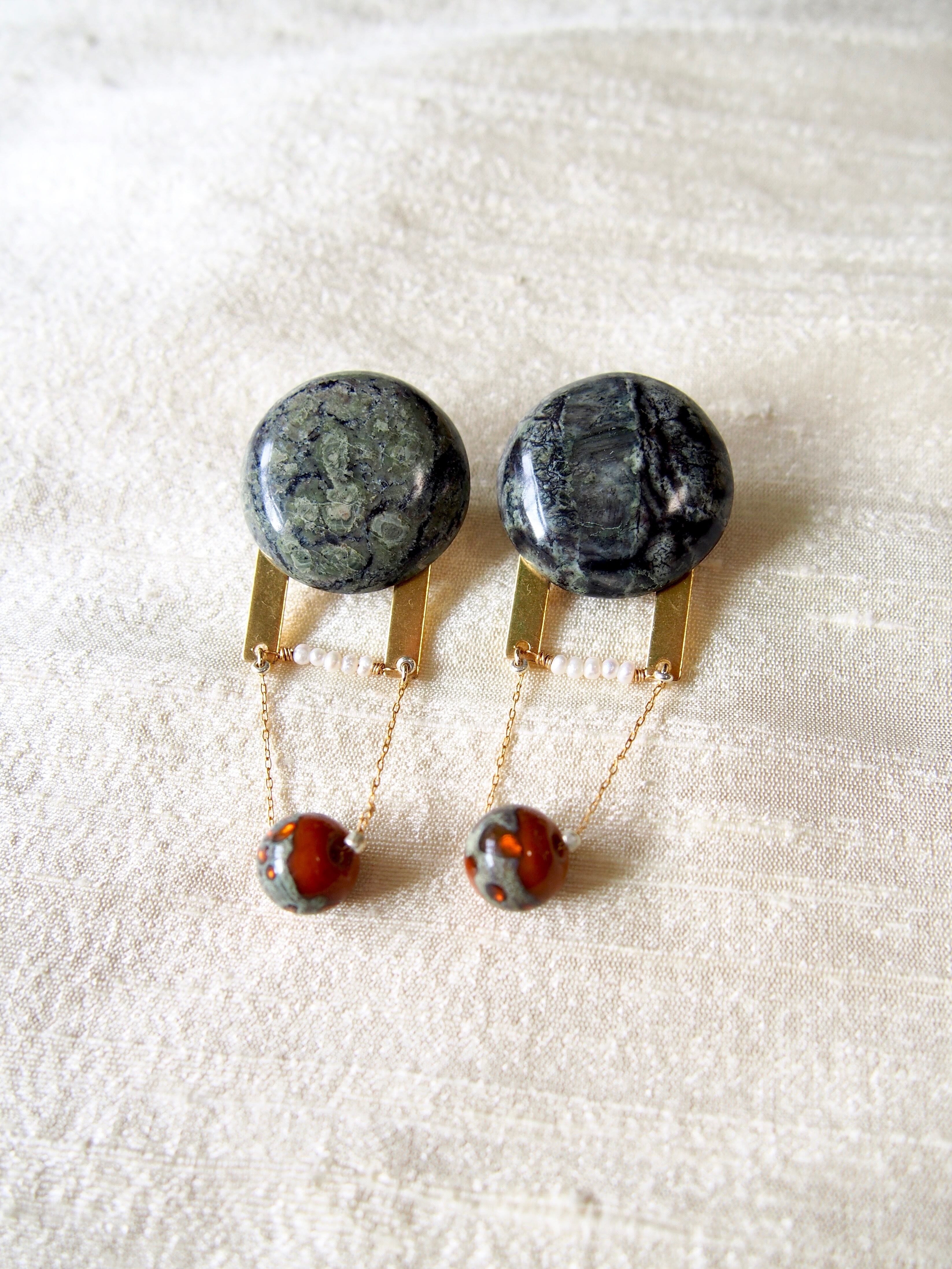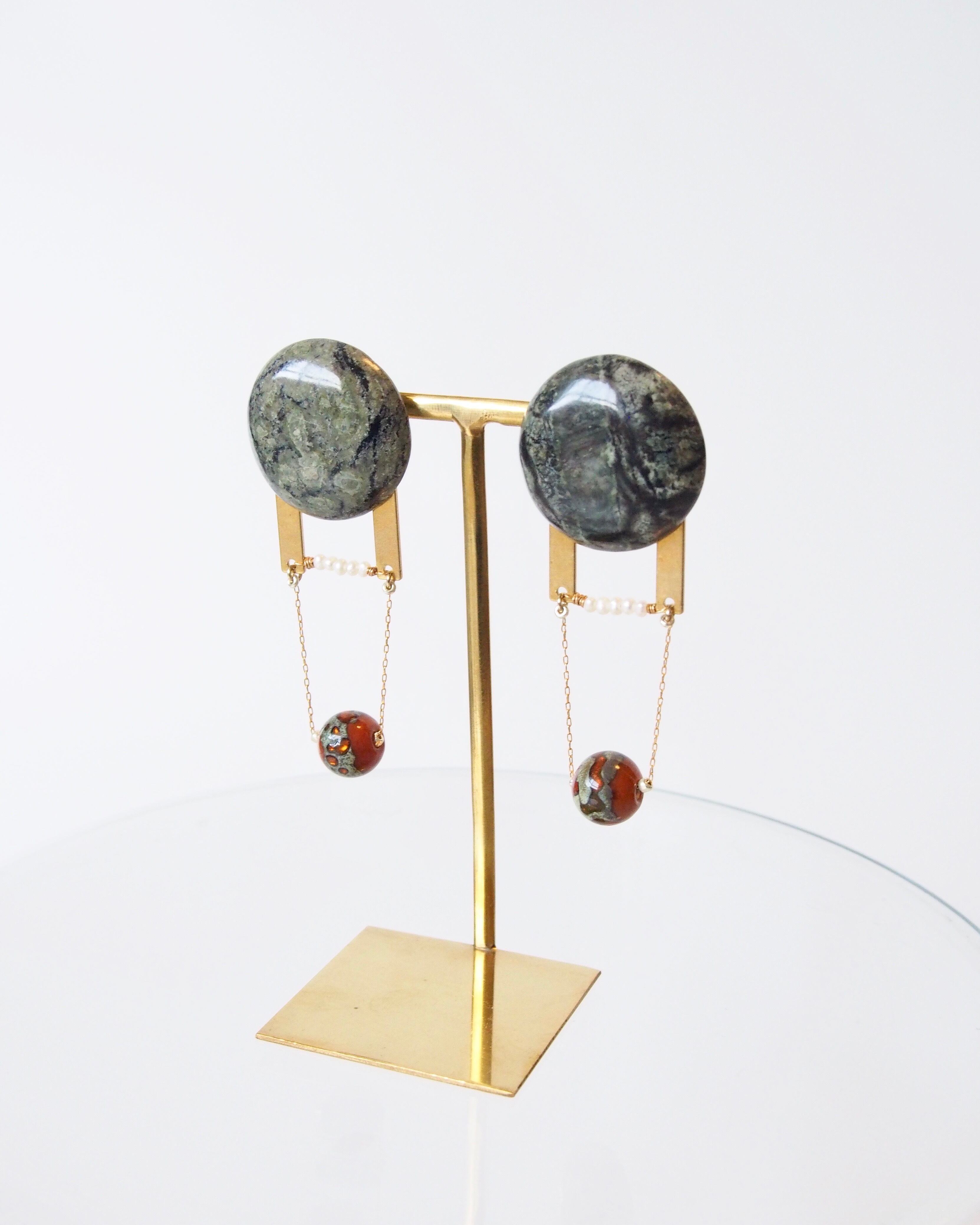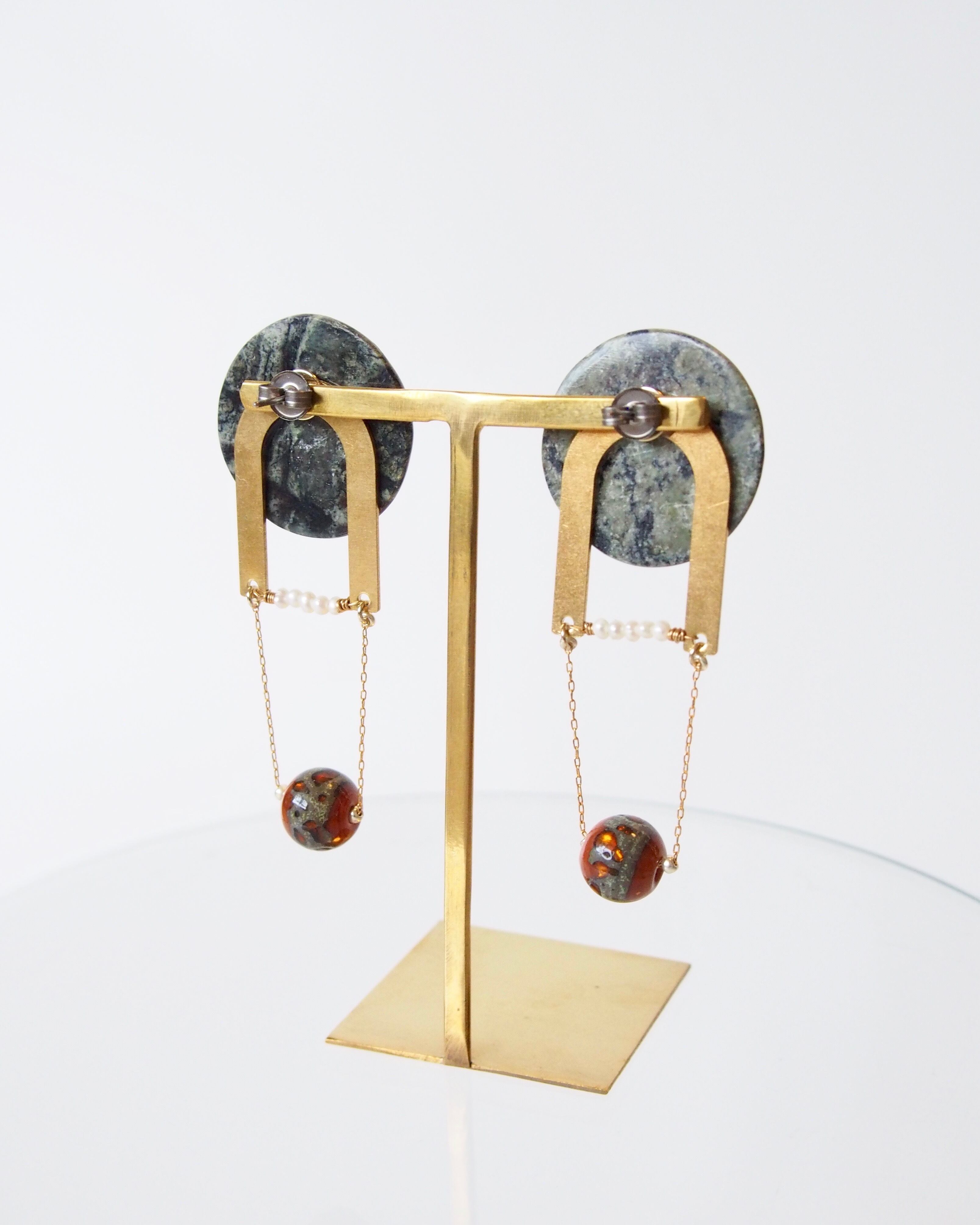 真鍮パーツ、極小のバロックパール、にぴったりなアーティスティックビーズを選び、様々な国で買い付けた異素材のパーツを組み合わせた、アートな雰囲気の漂う抽象画のようなピアスです。