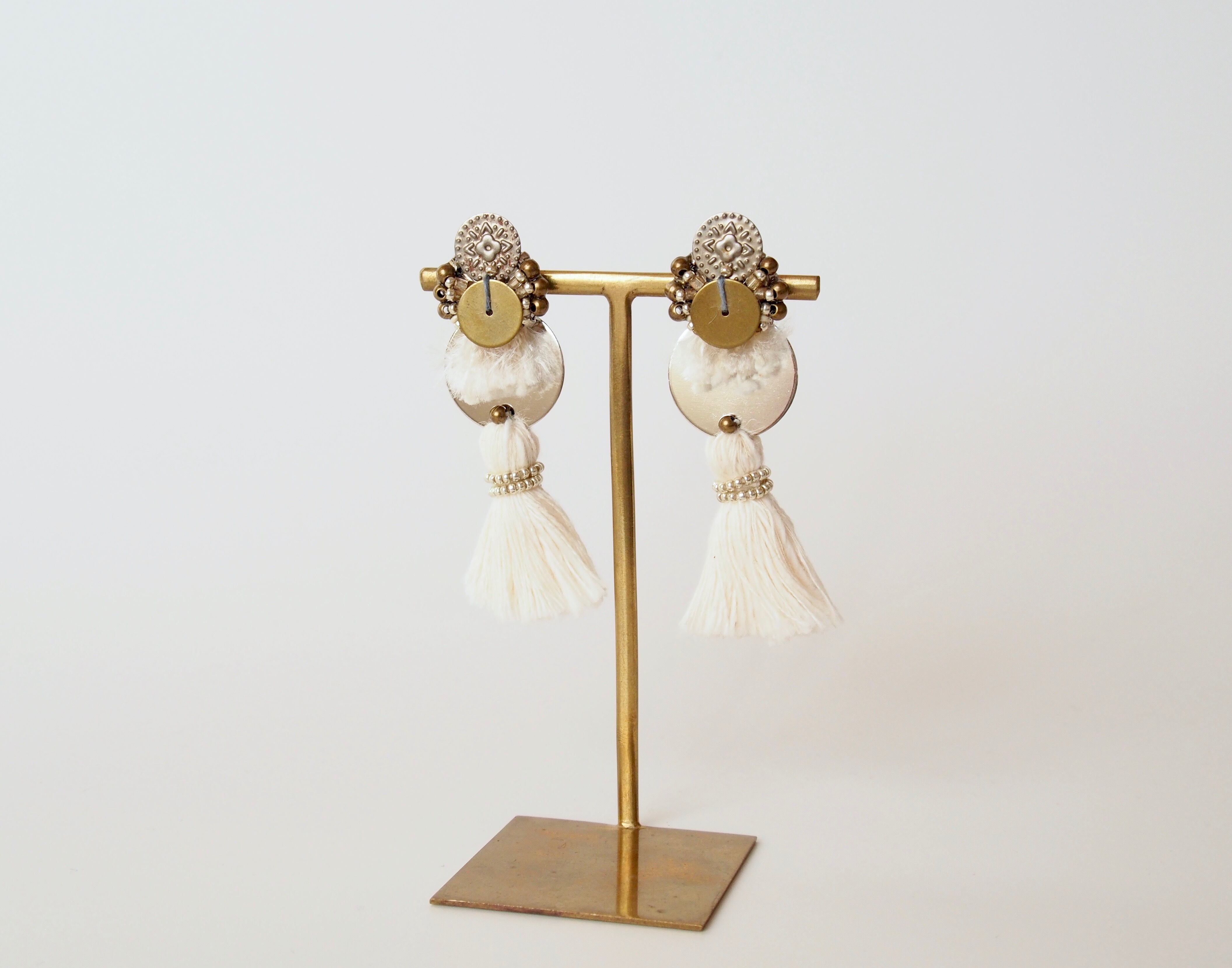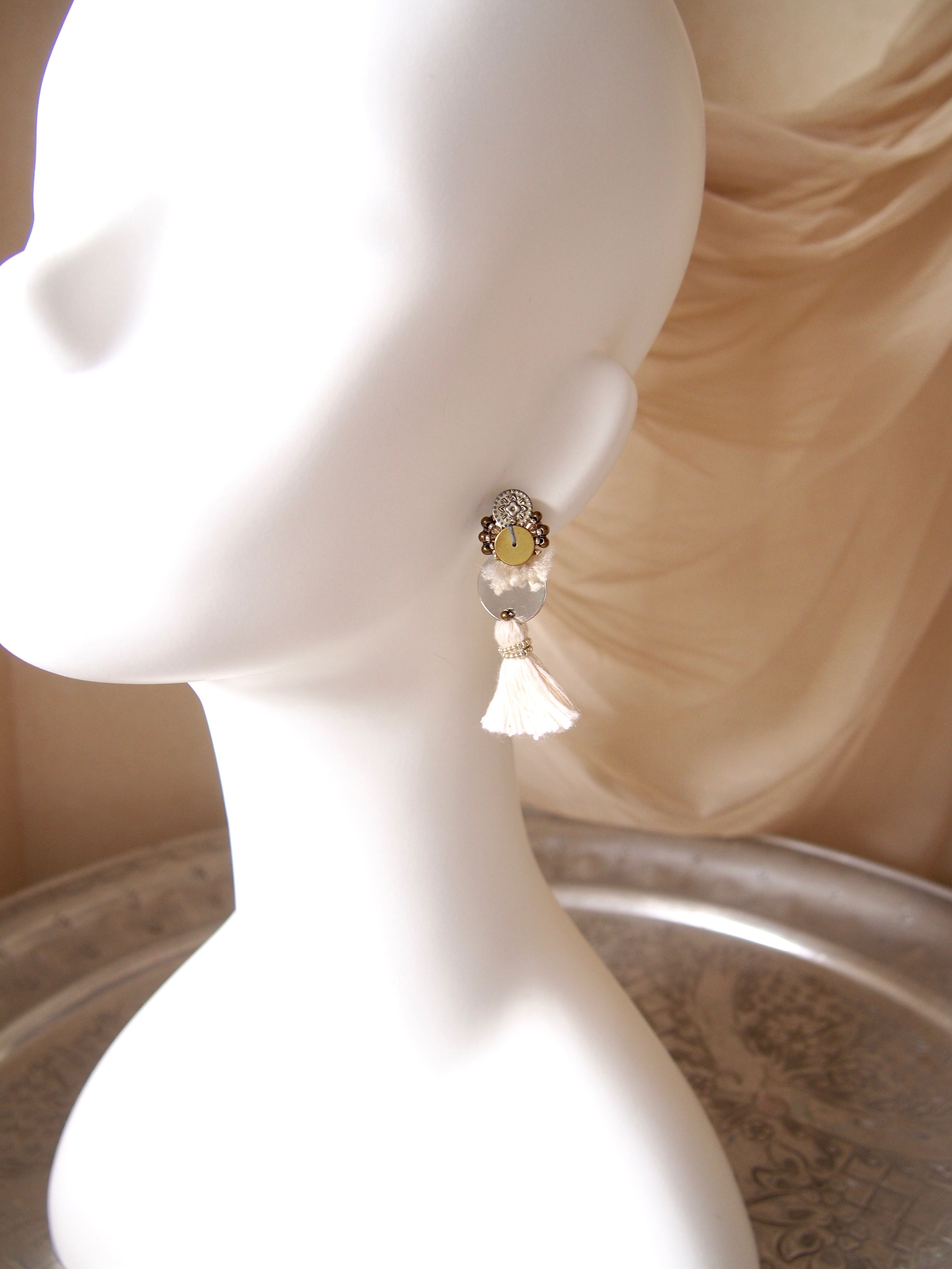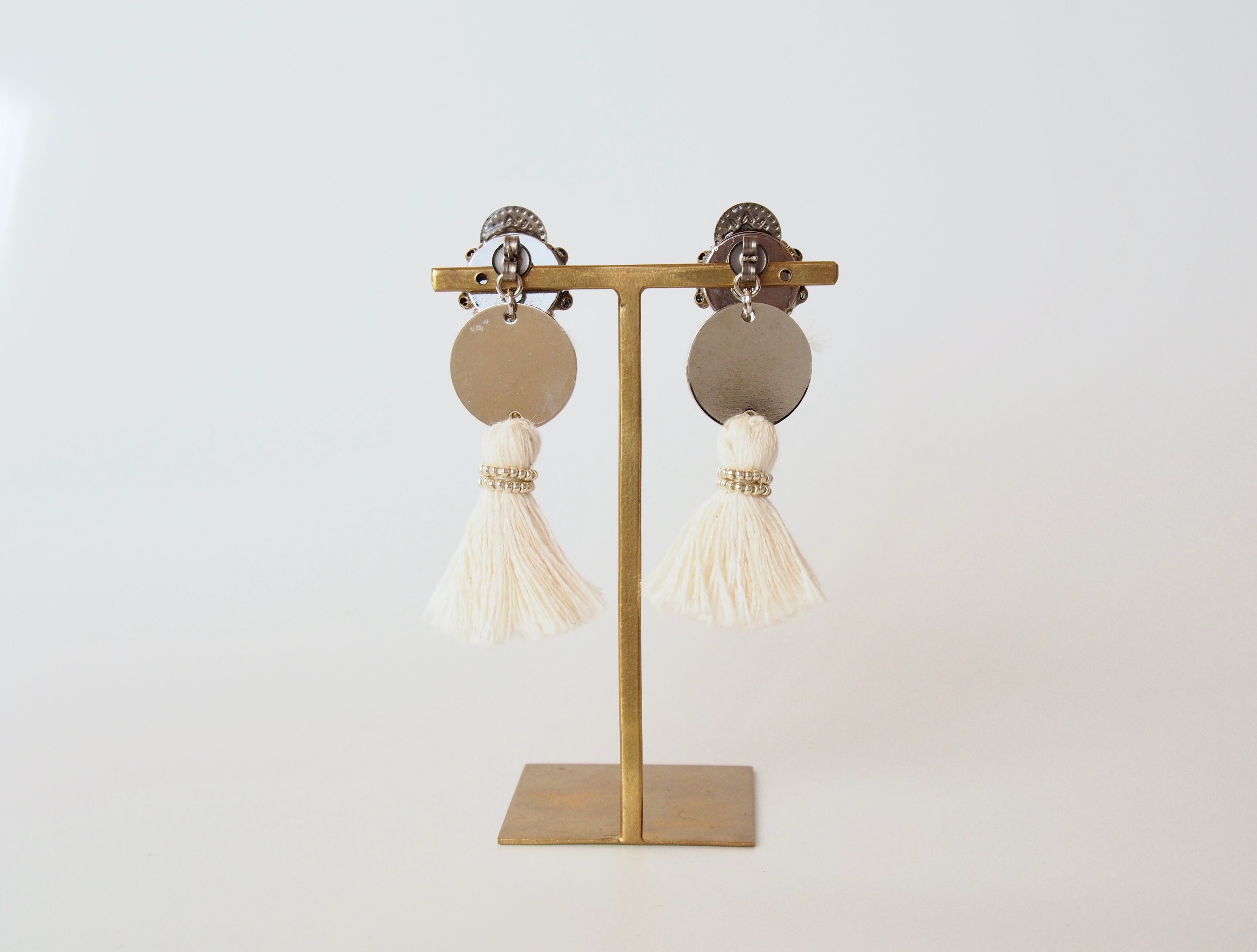 コットンのタッセルの異素材を組み合わせたオリエンタルなイメージのピアス/クリップです。