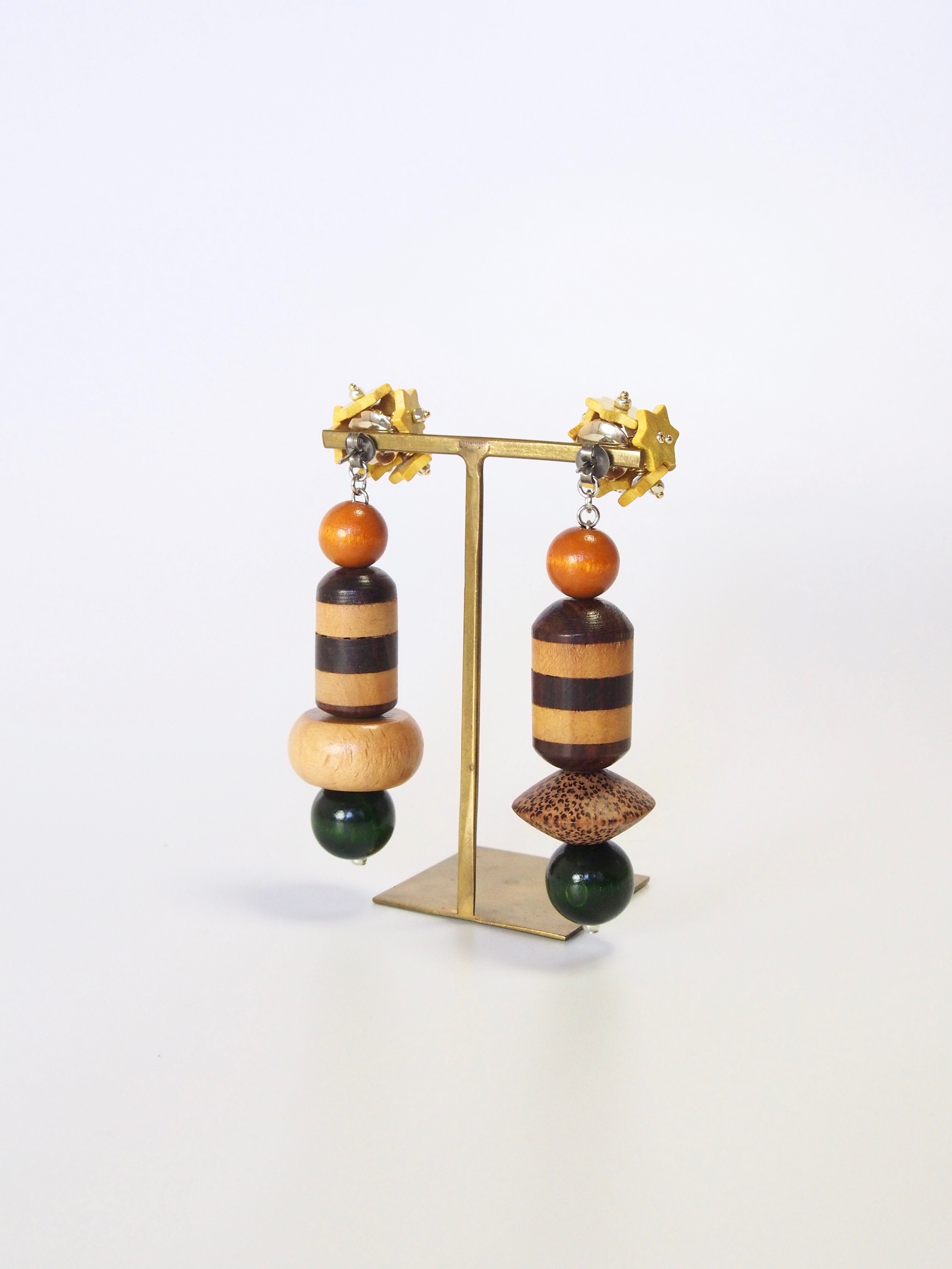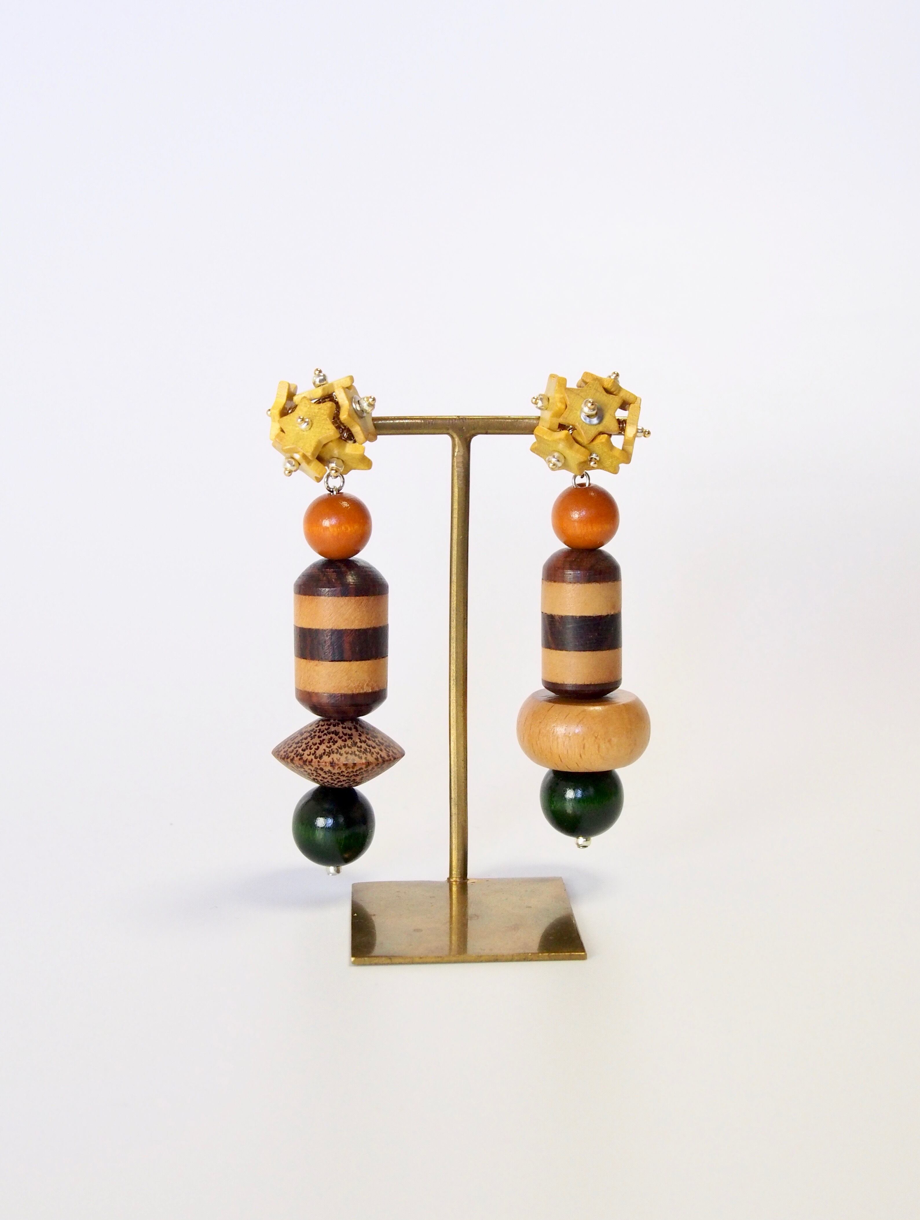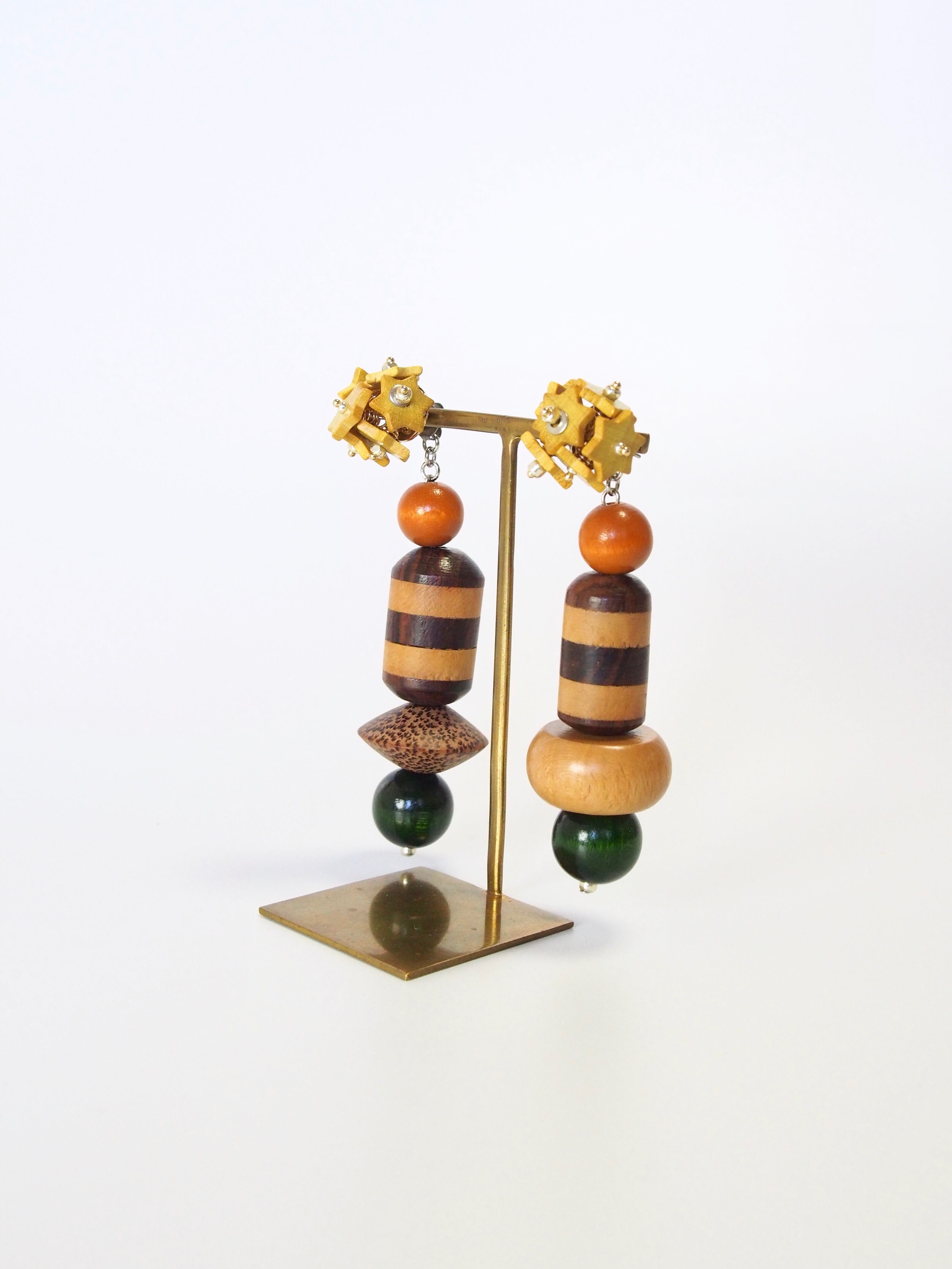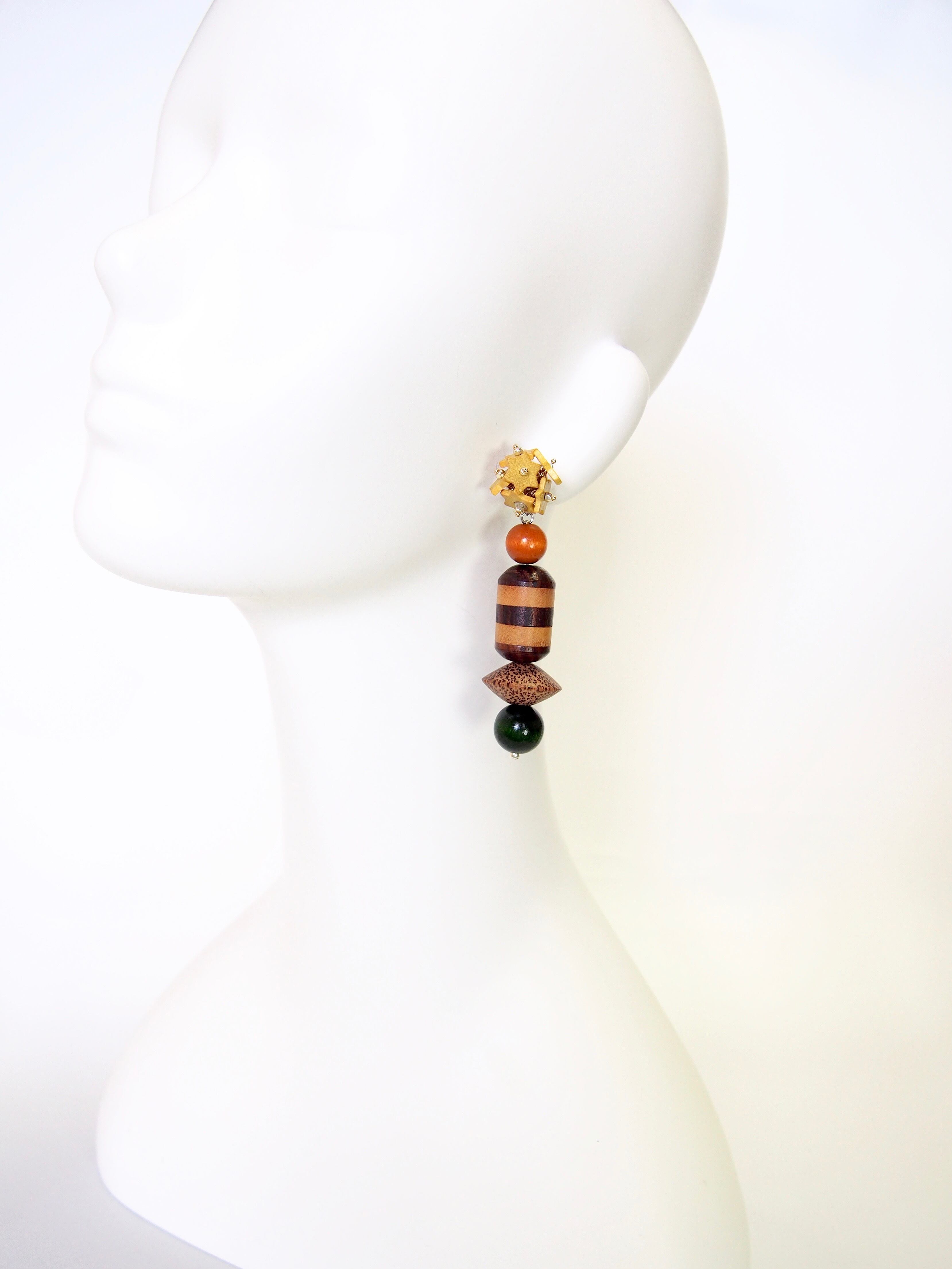 旅先で仕入れた手の込んだデザインのウッドビーズやアクリルパーツを