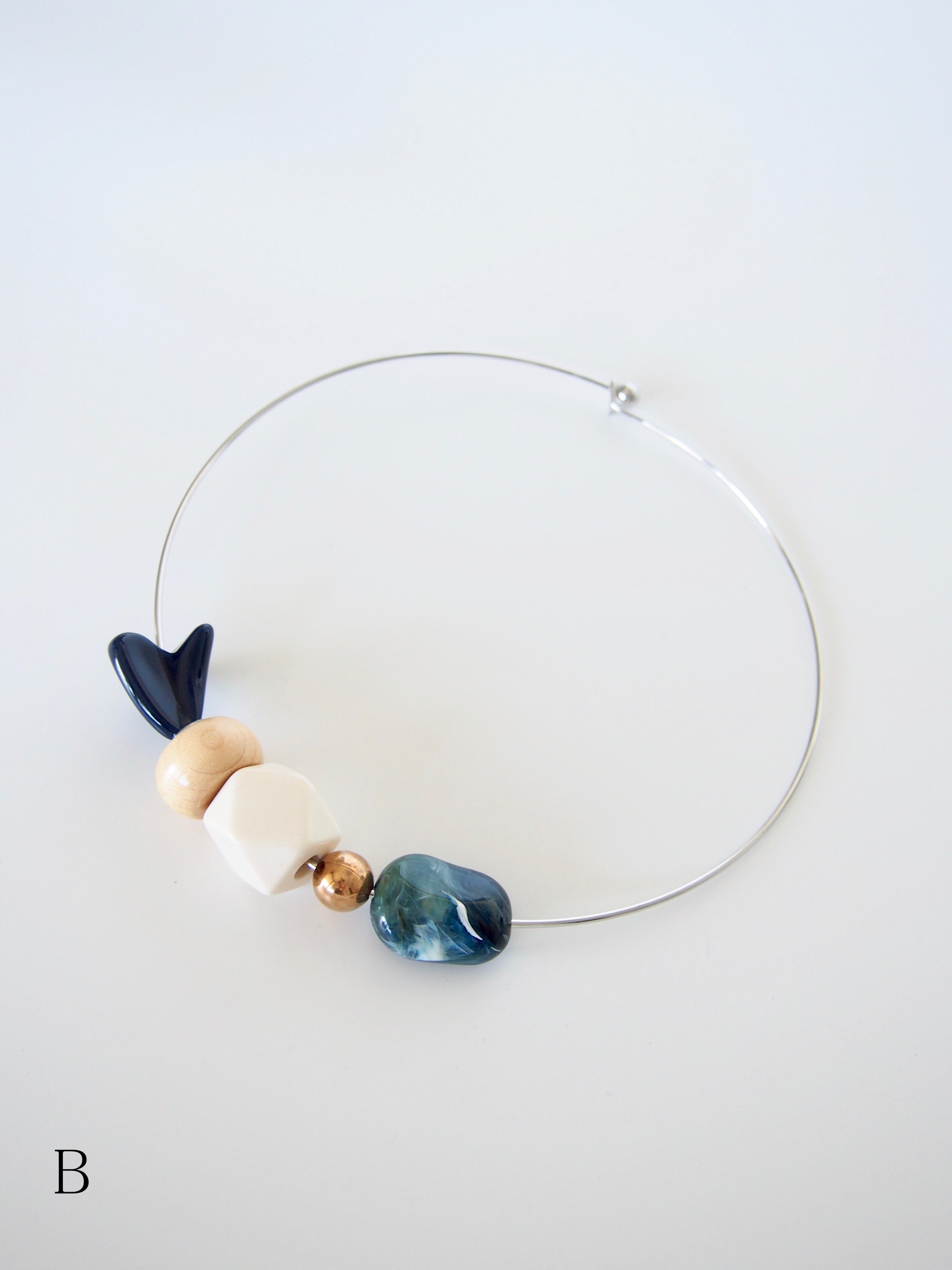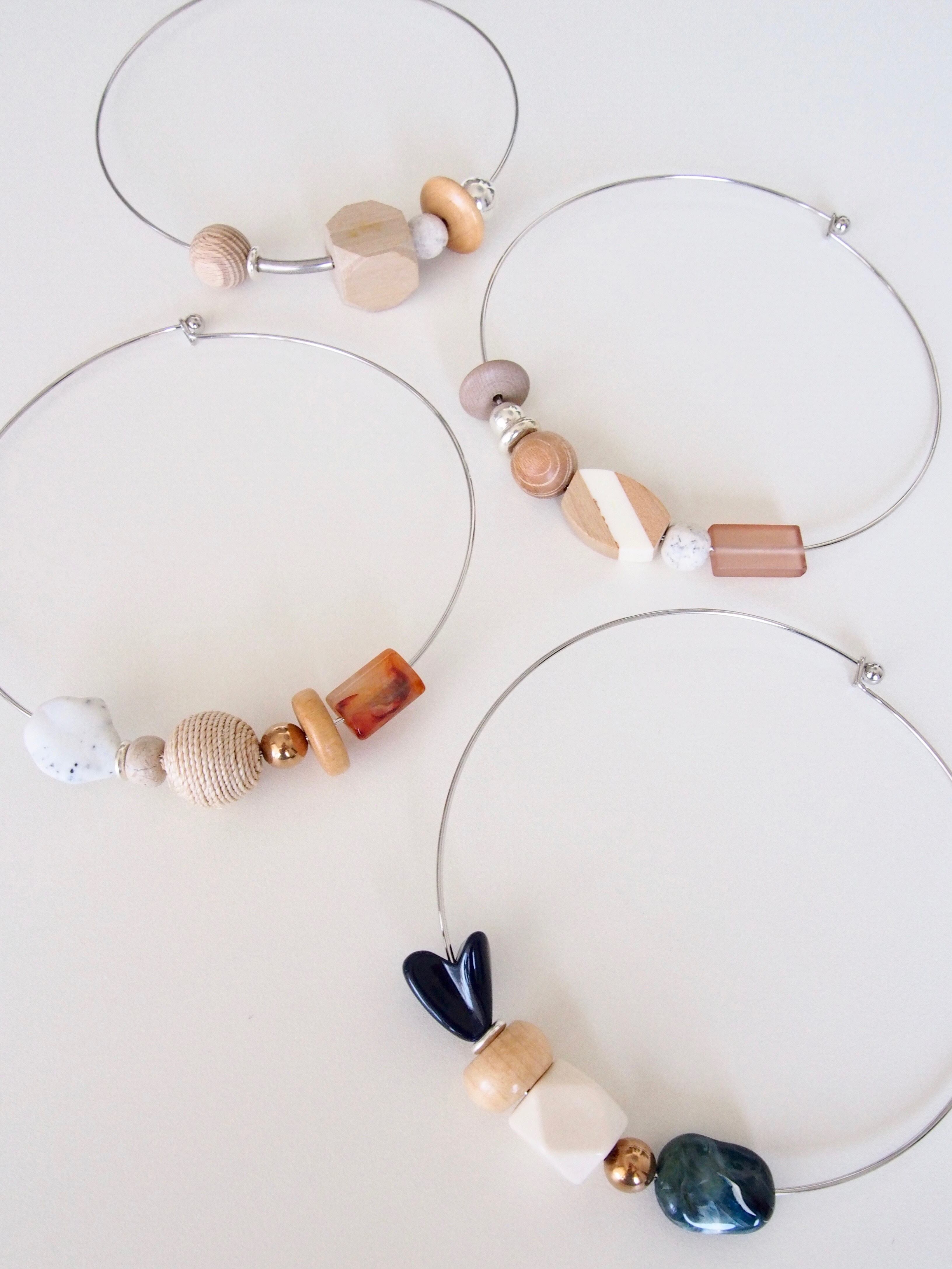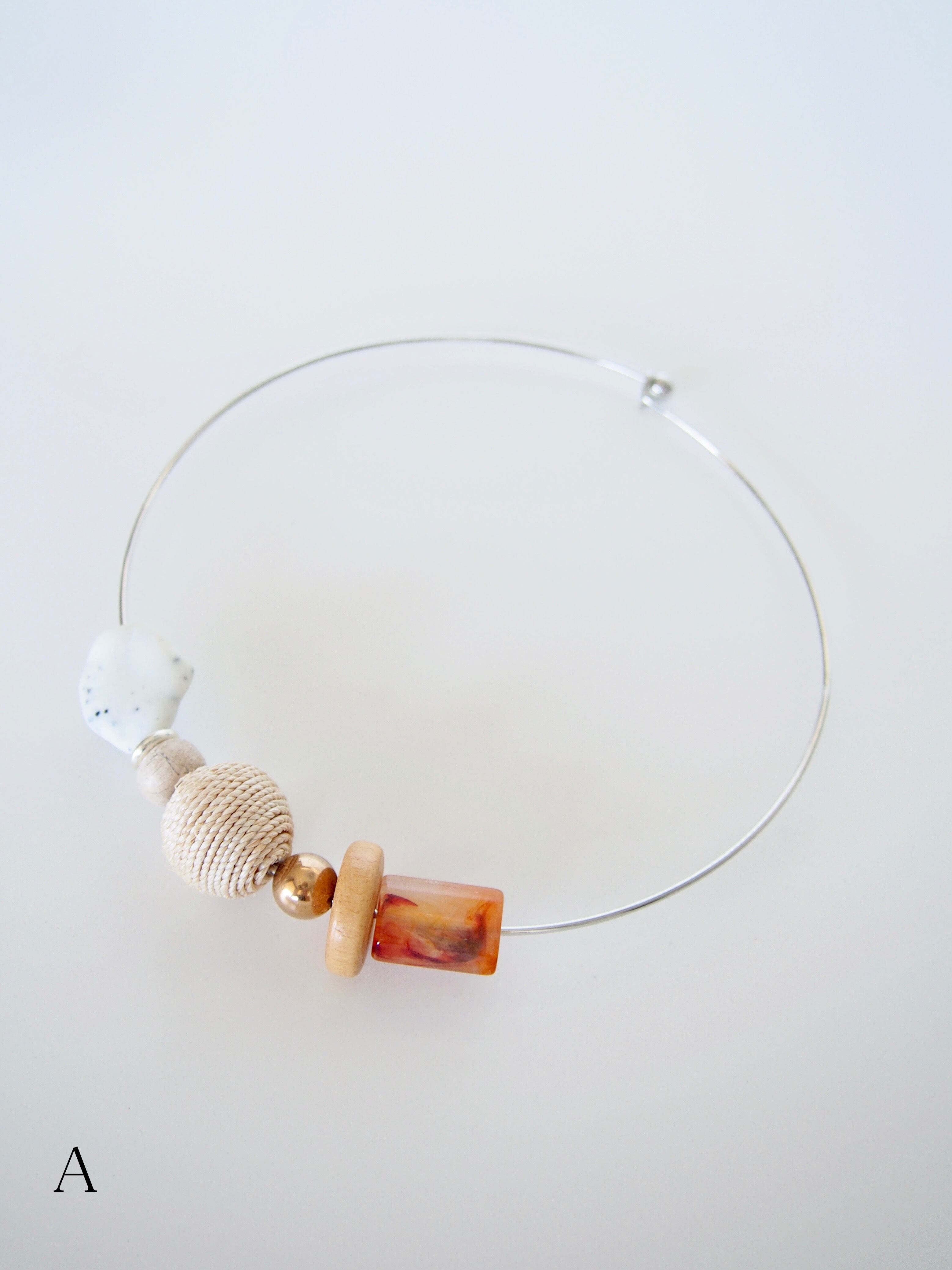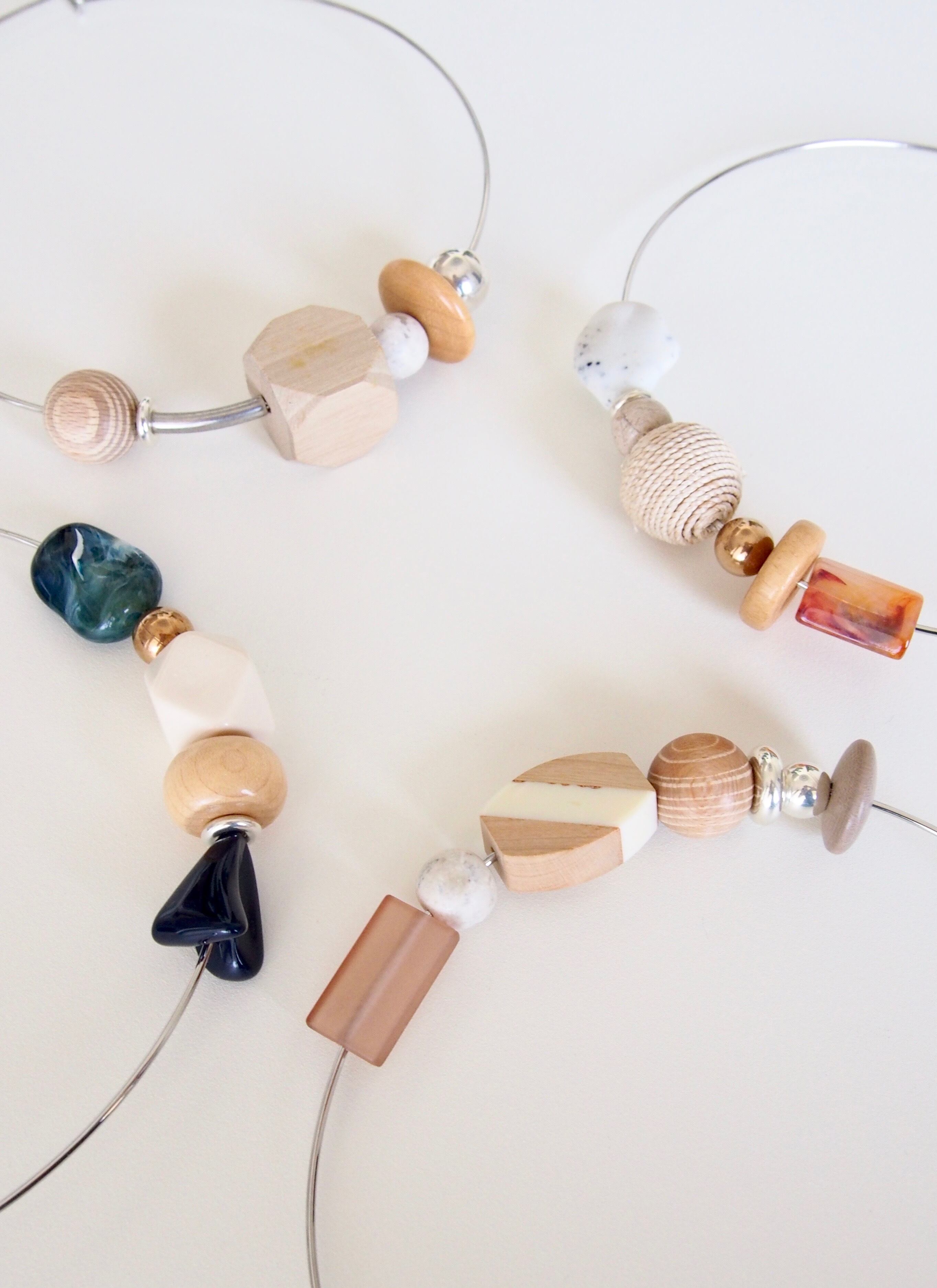 ウッドビーズやメタルビーズ、ビンテージのアクリルビーズをポイントにした、