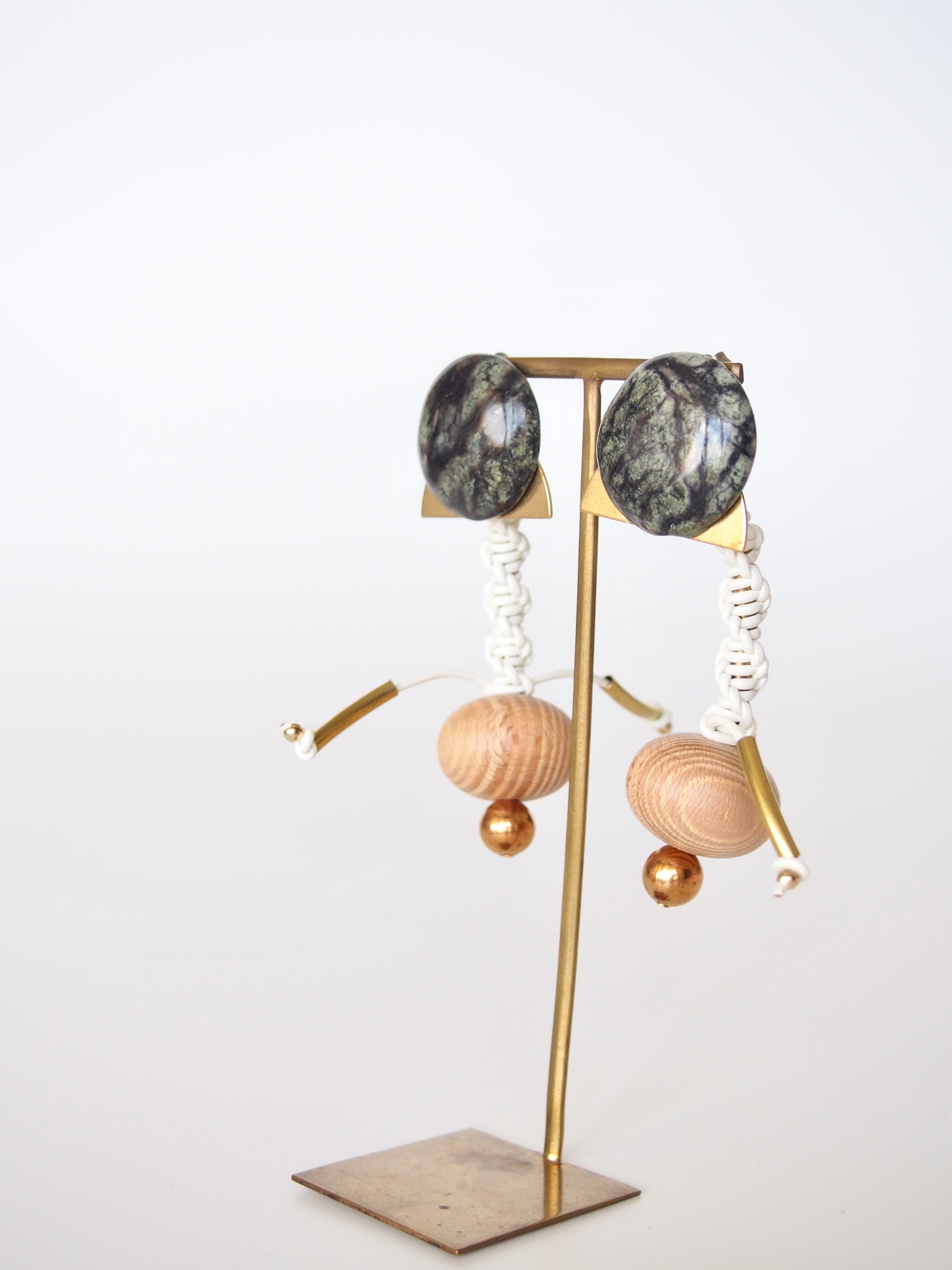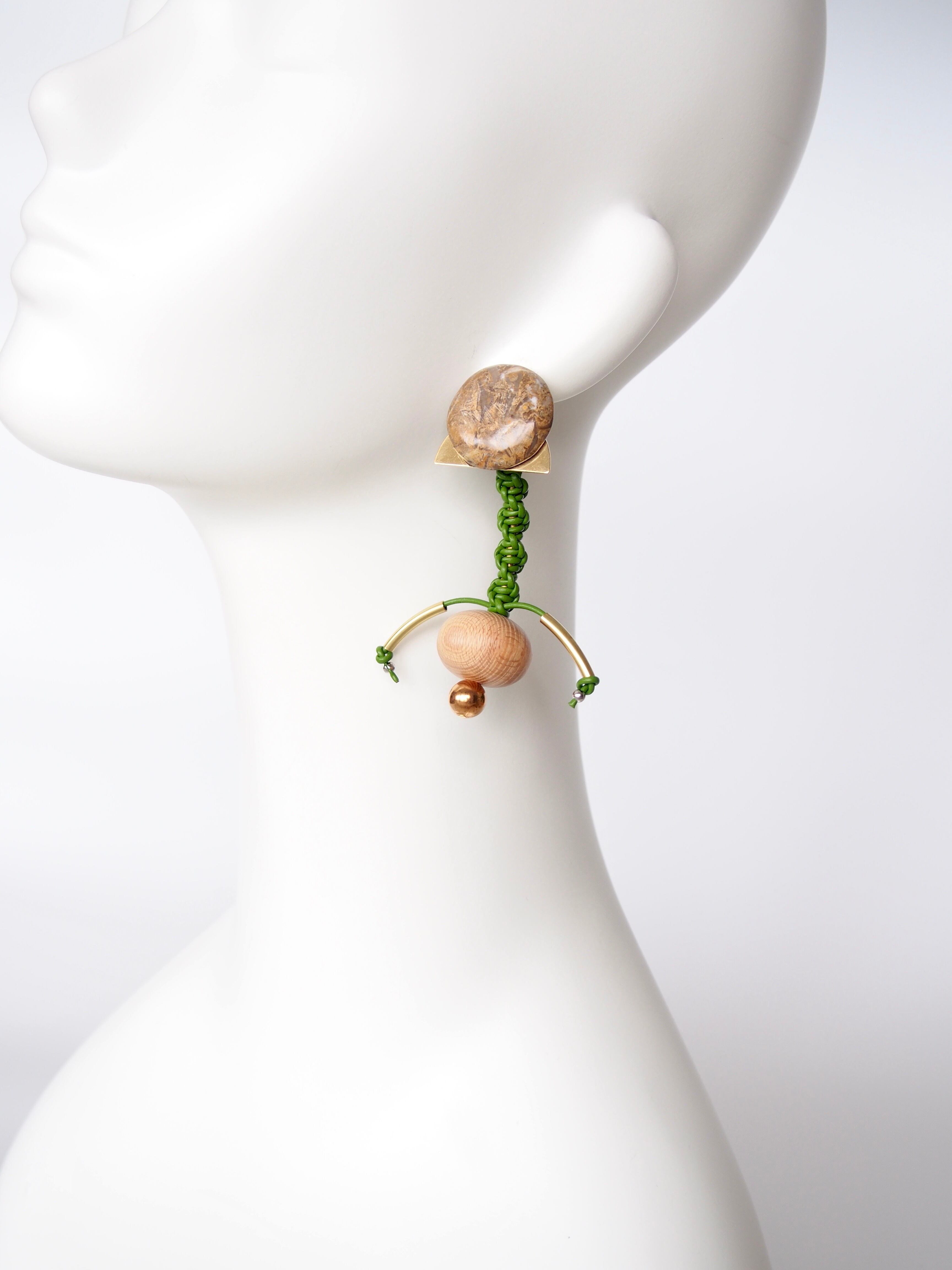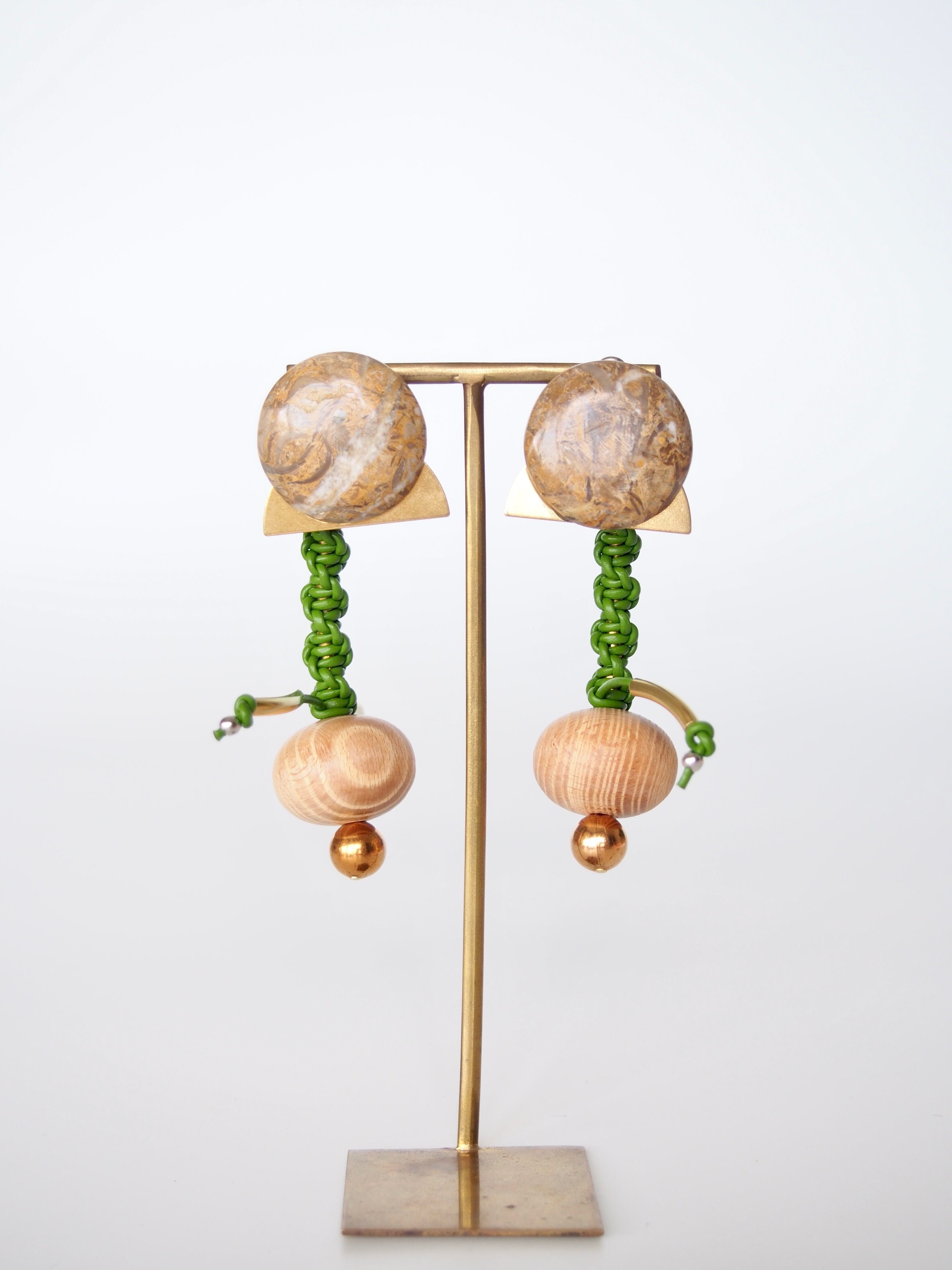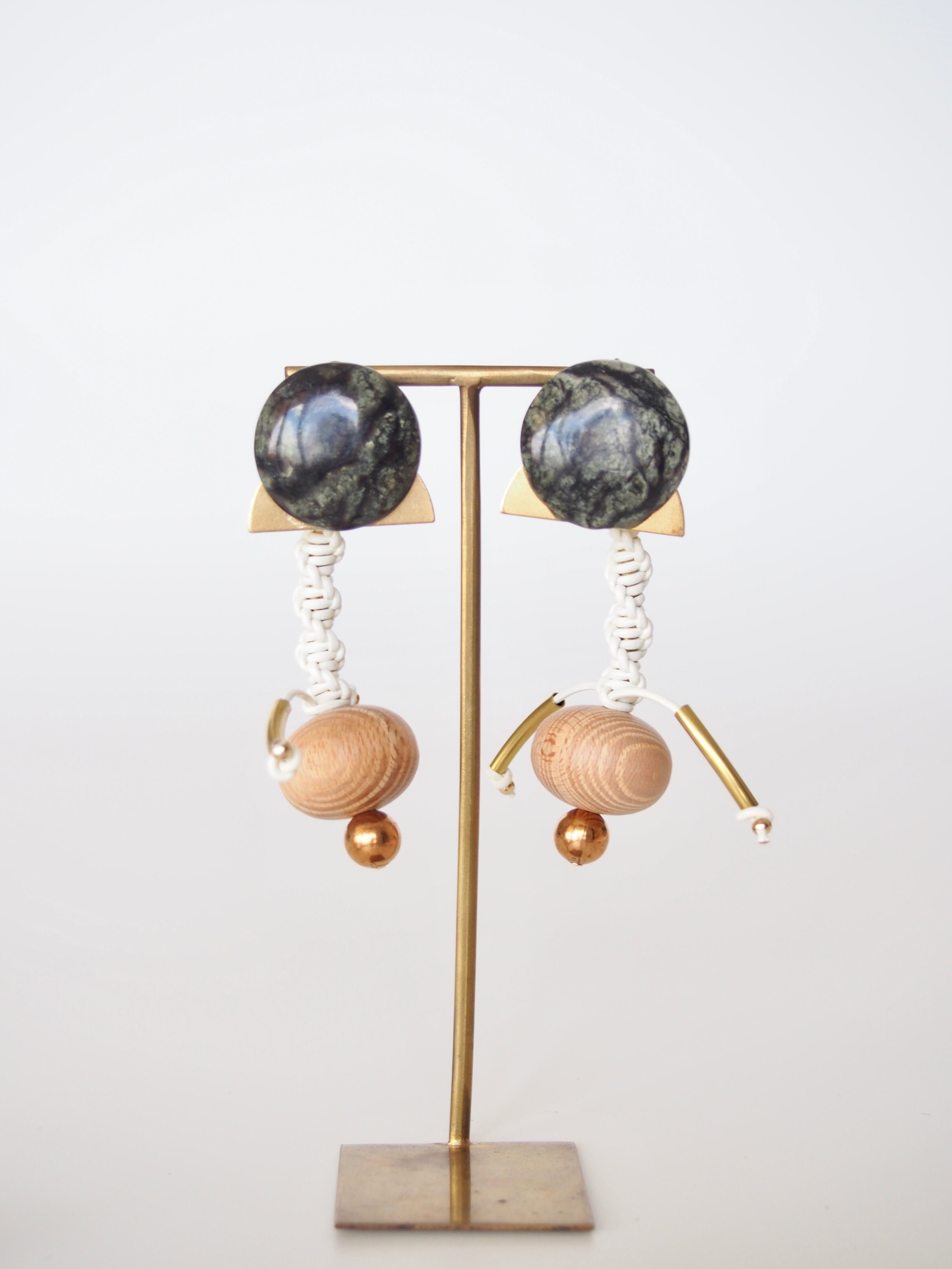 カラーストーンに真鍮のパーツがちらりとアクセントになったトップのデザインに、