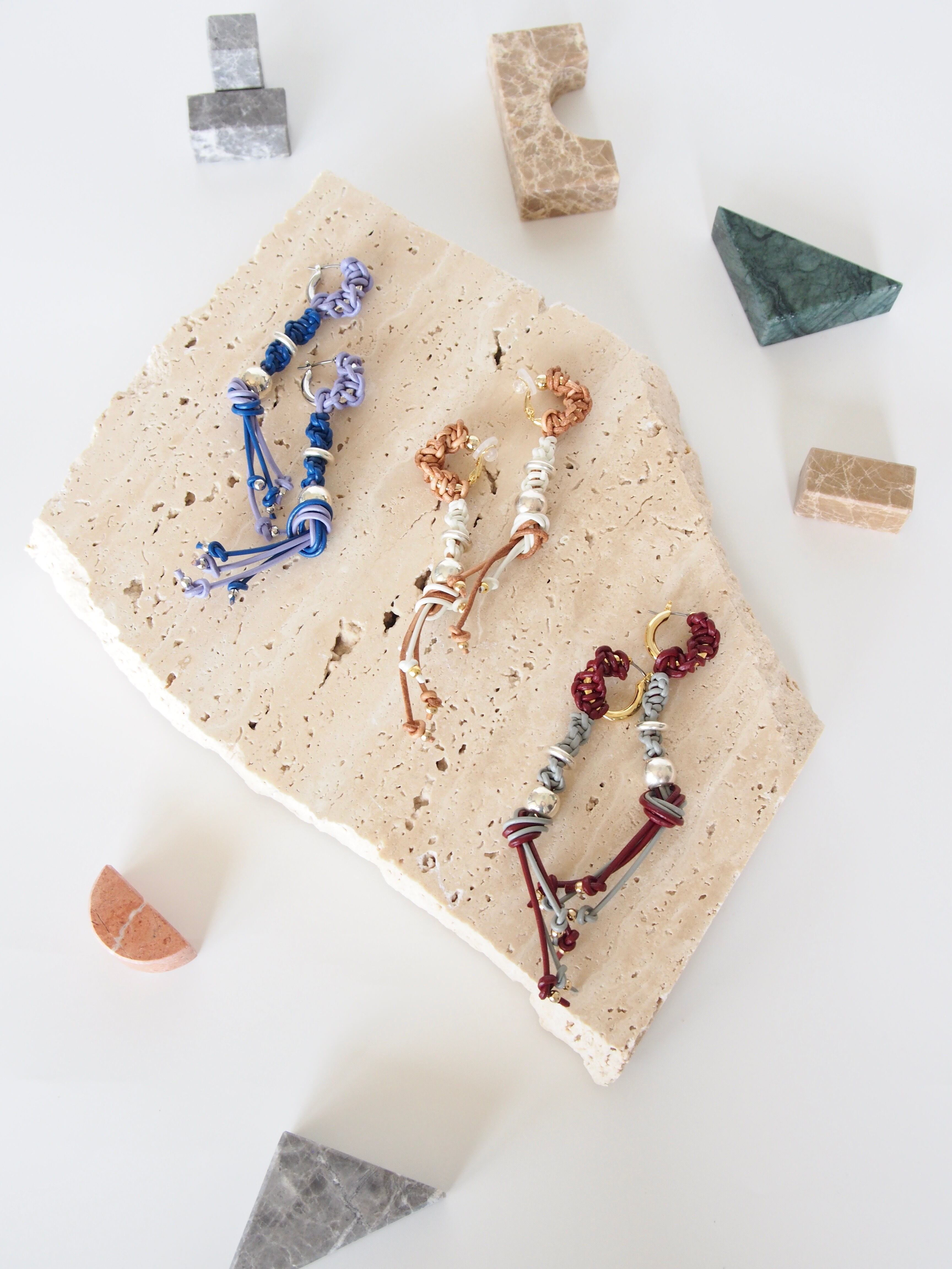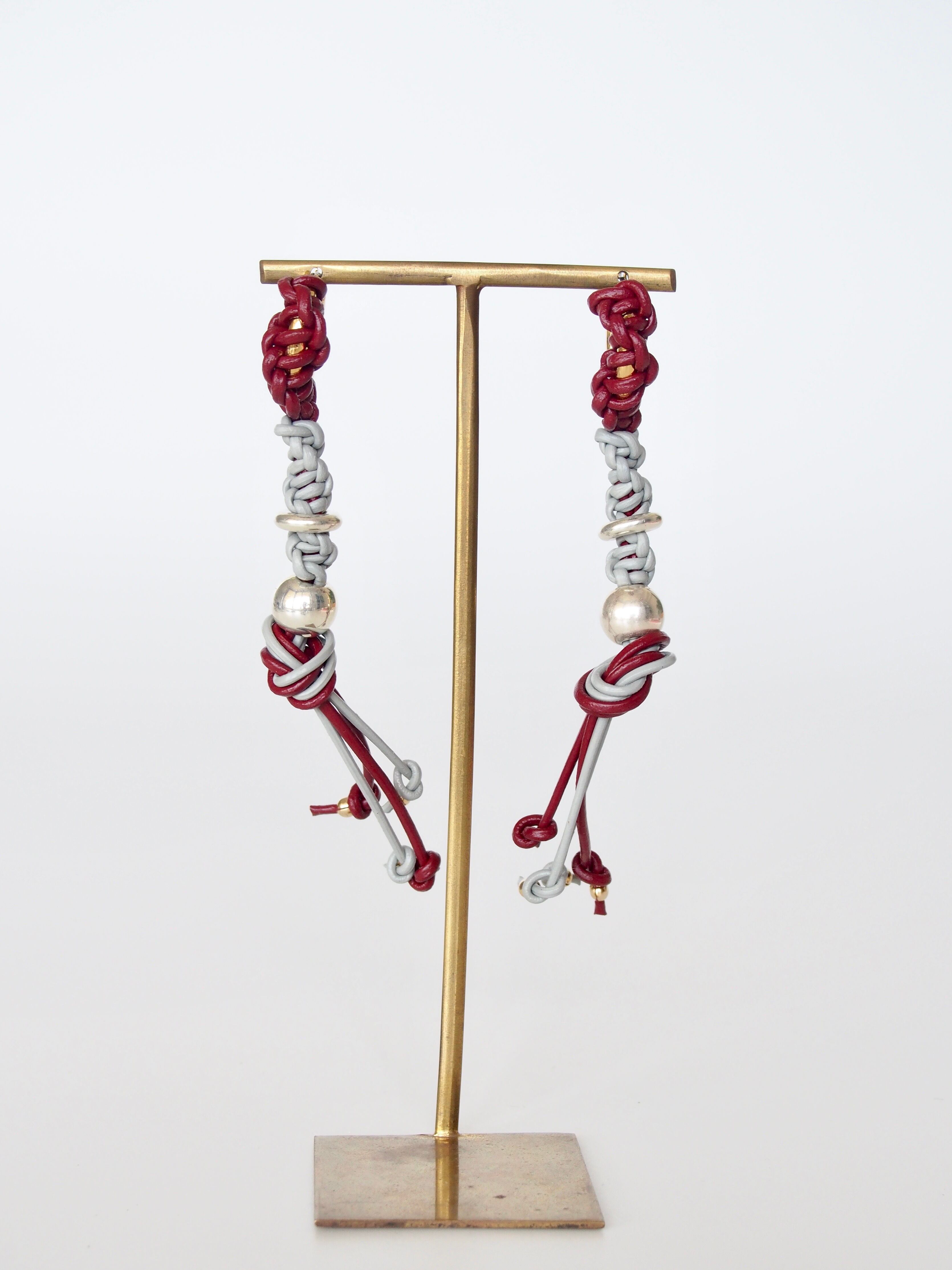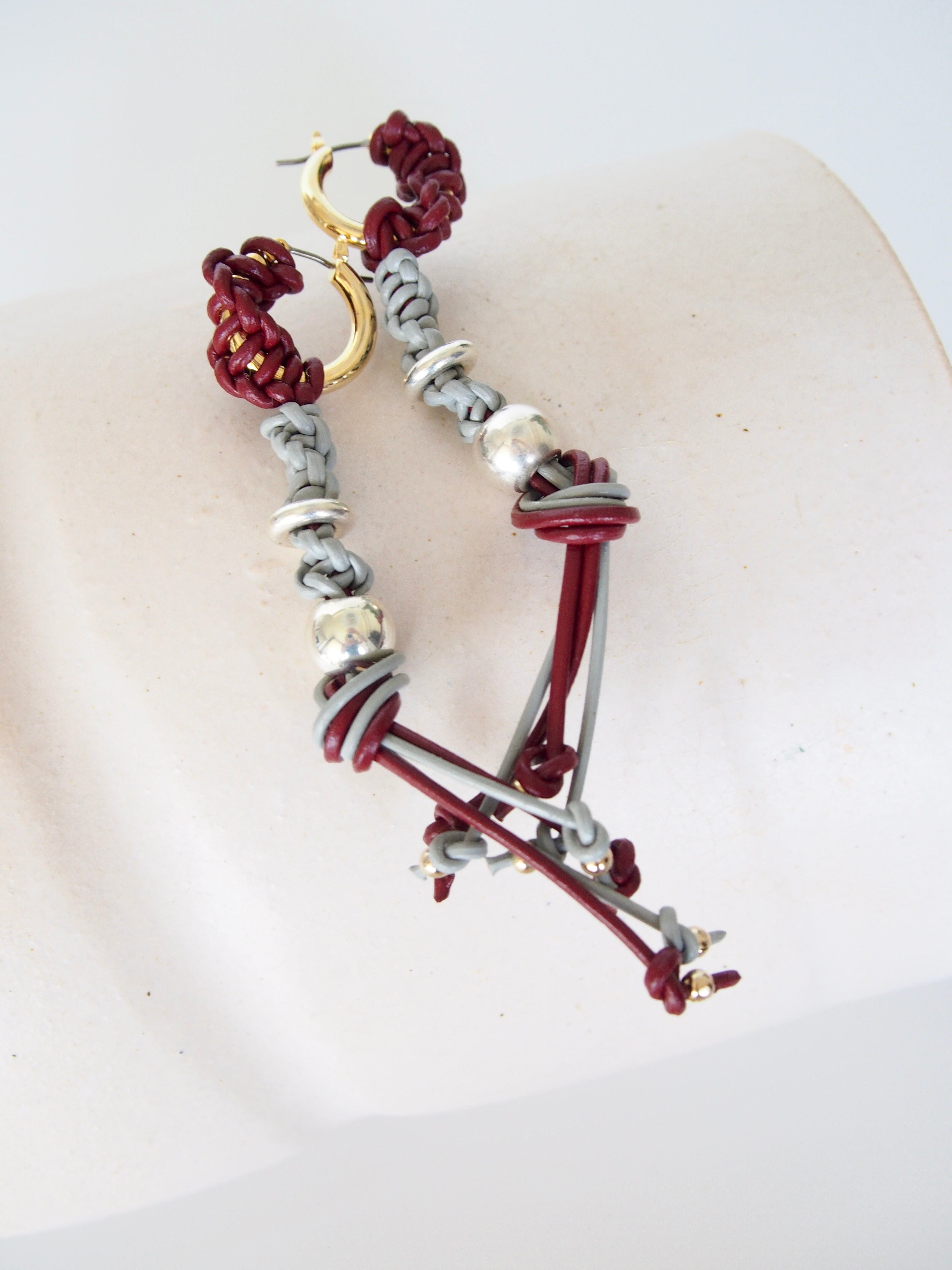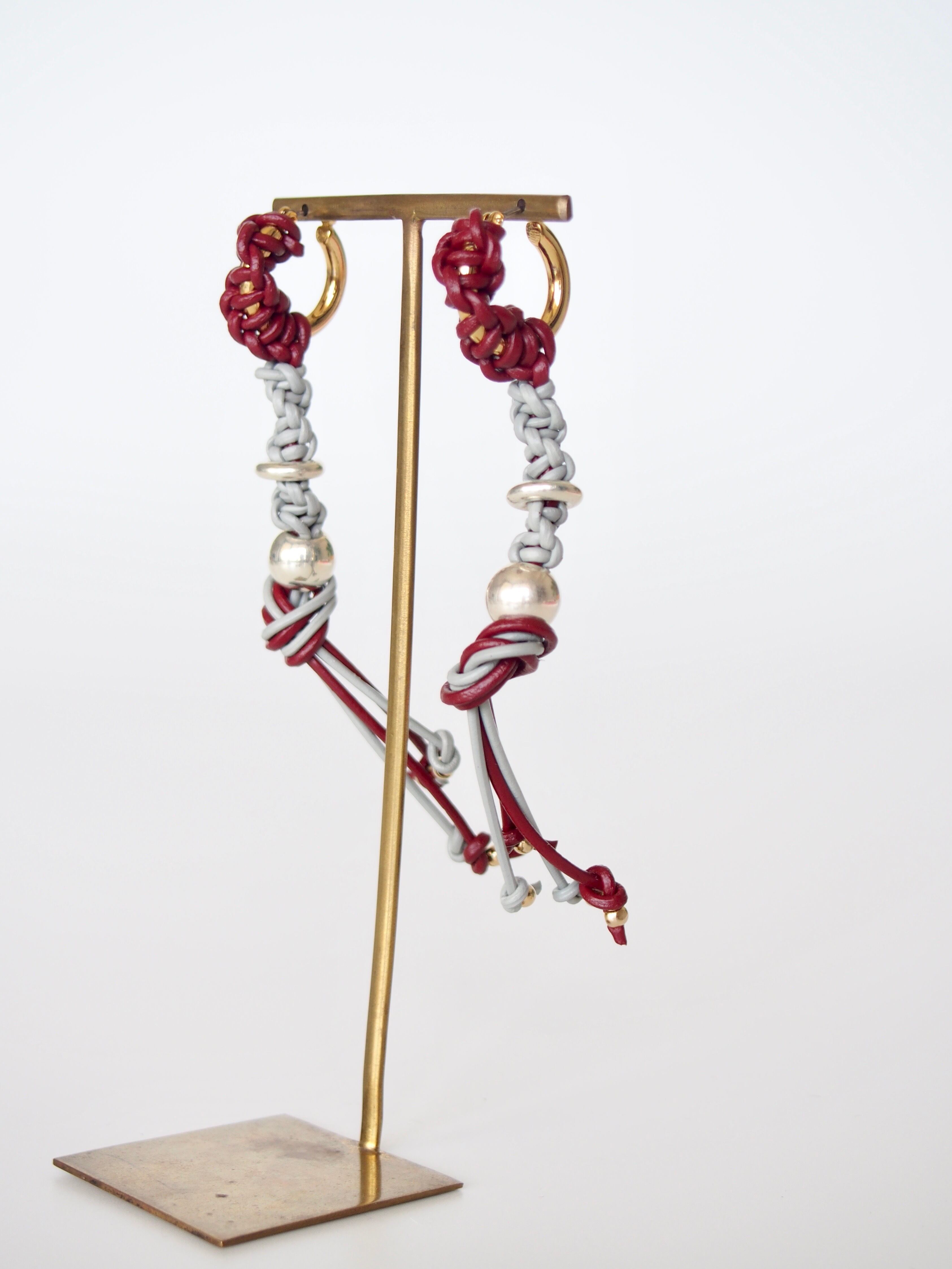 色の組み合わせで遊んだ、フープ形にカラーレザーの編み込みとノットのデザインが目新しい、