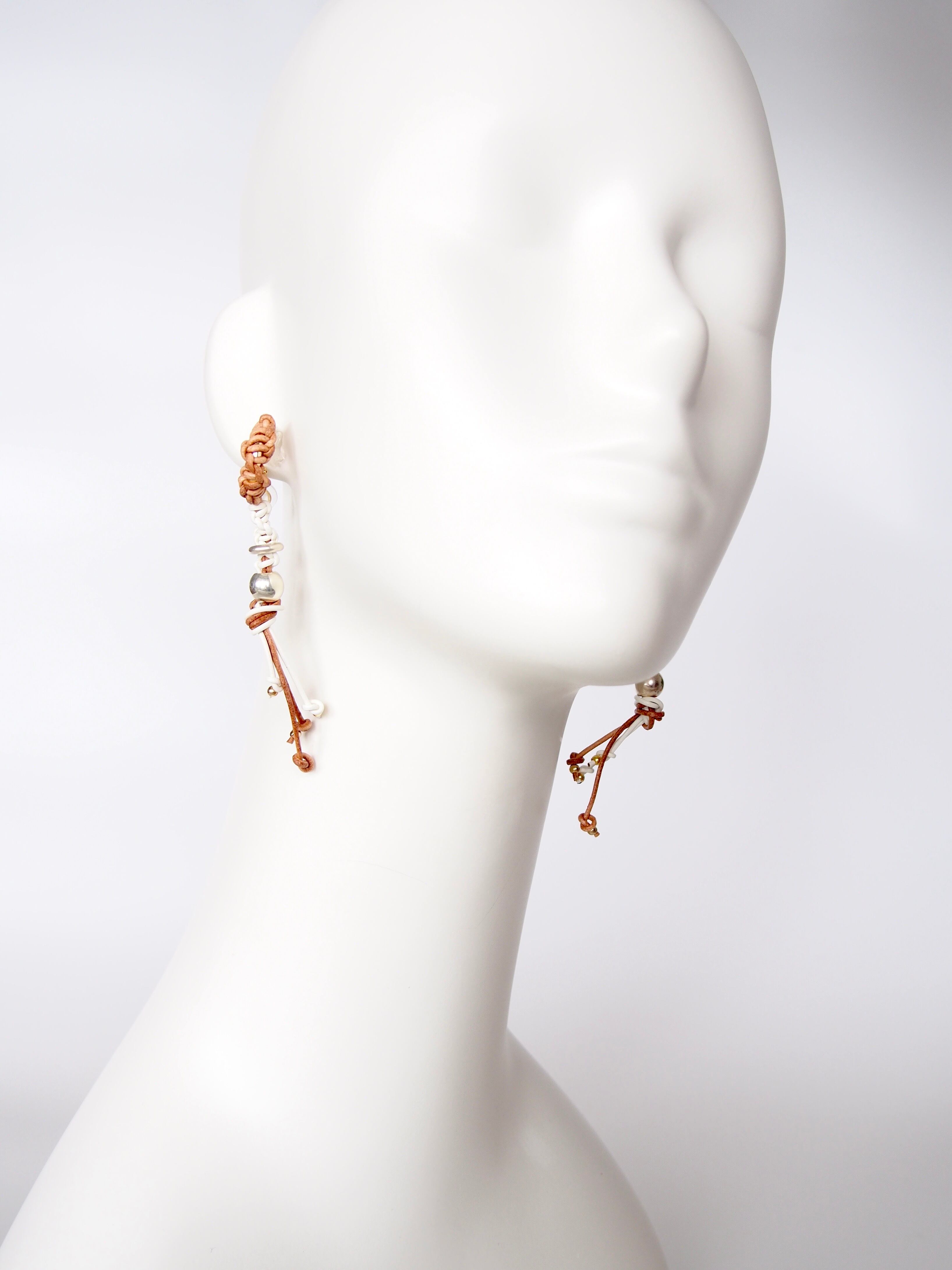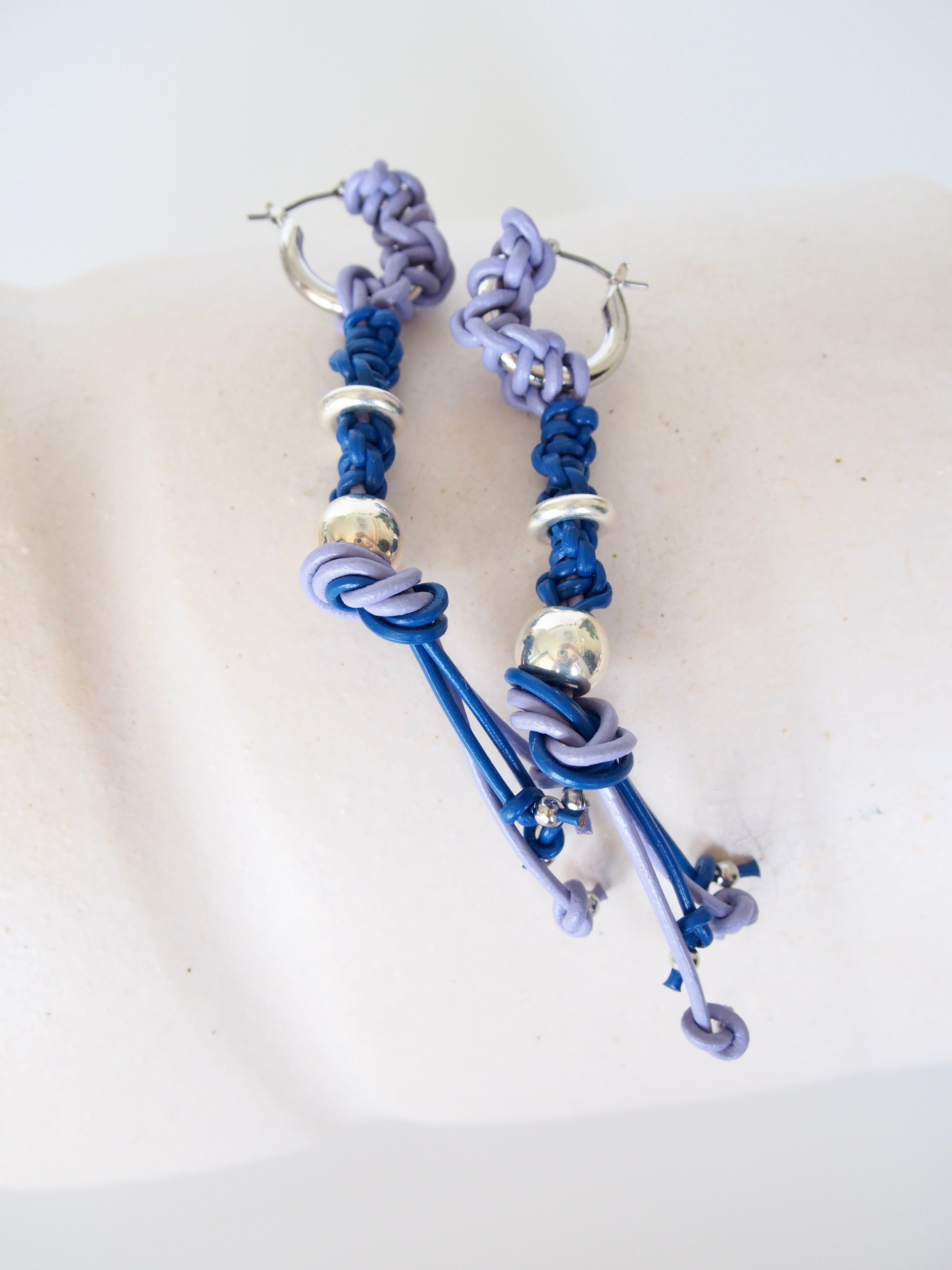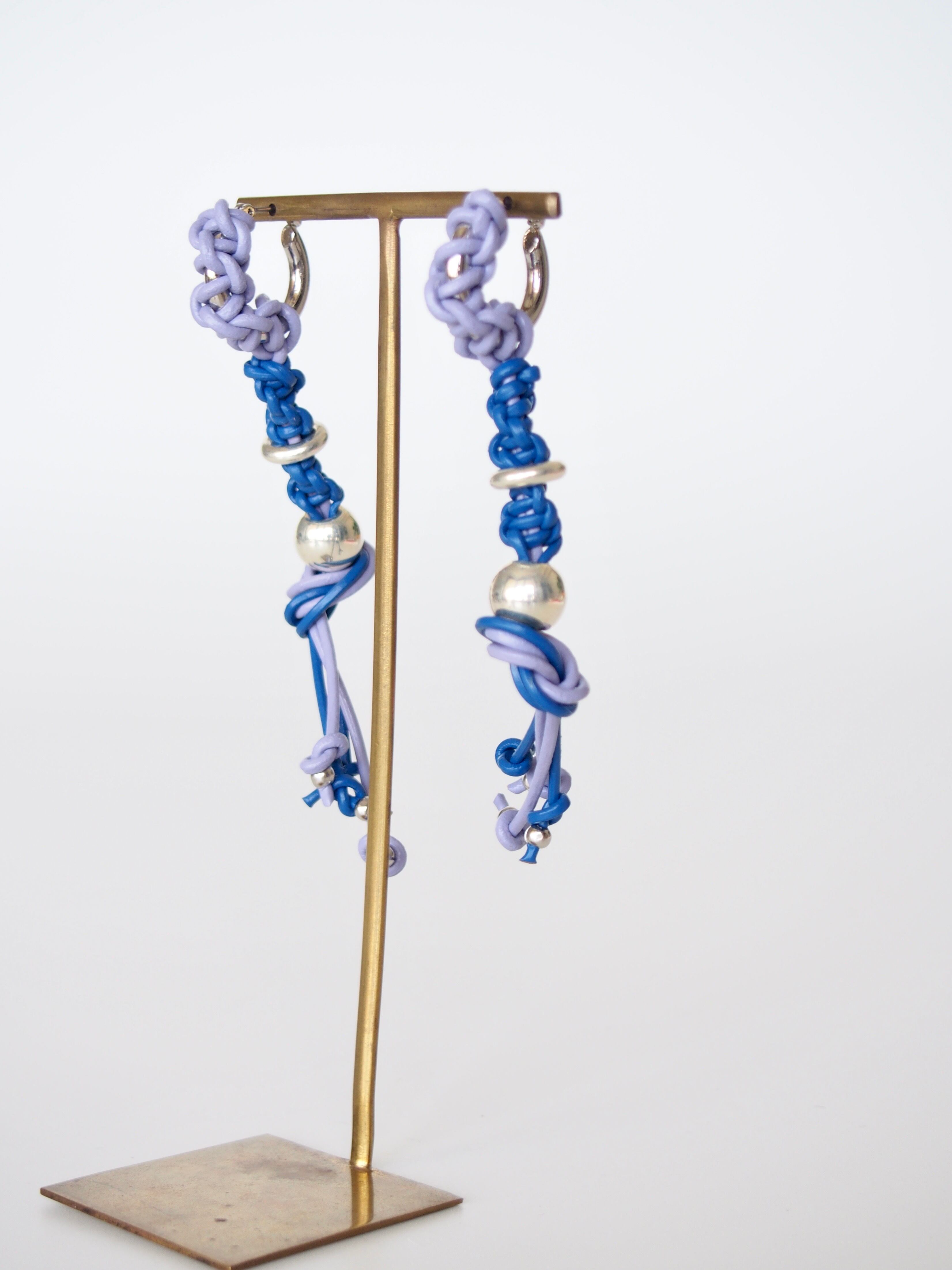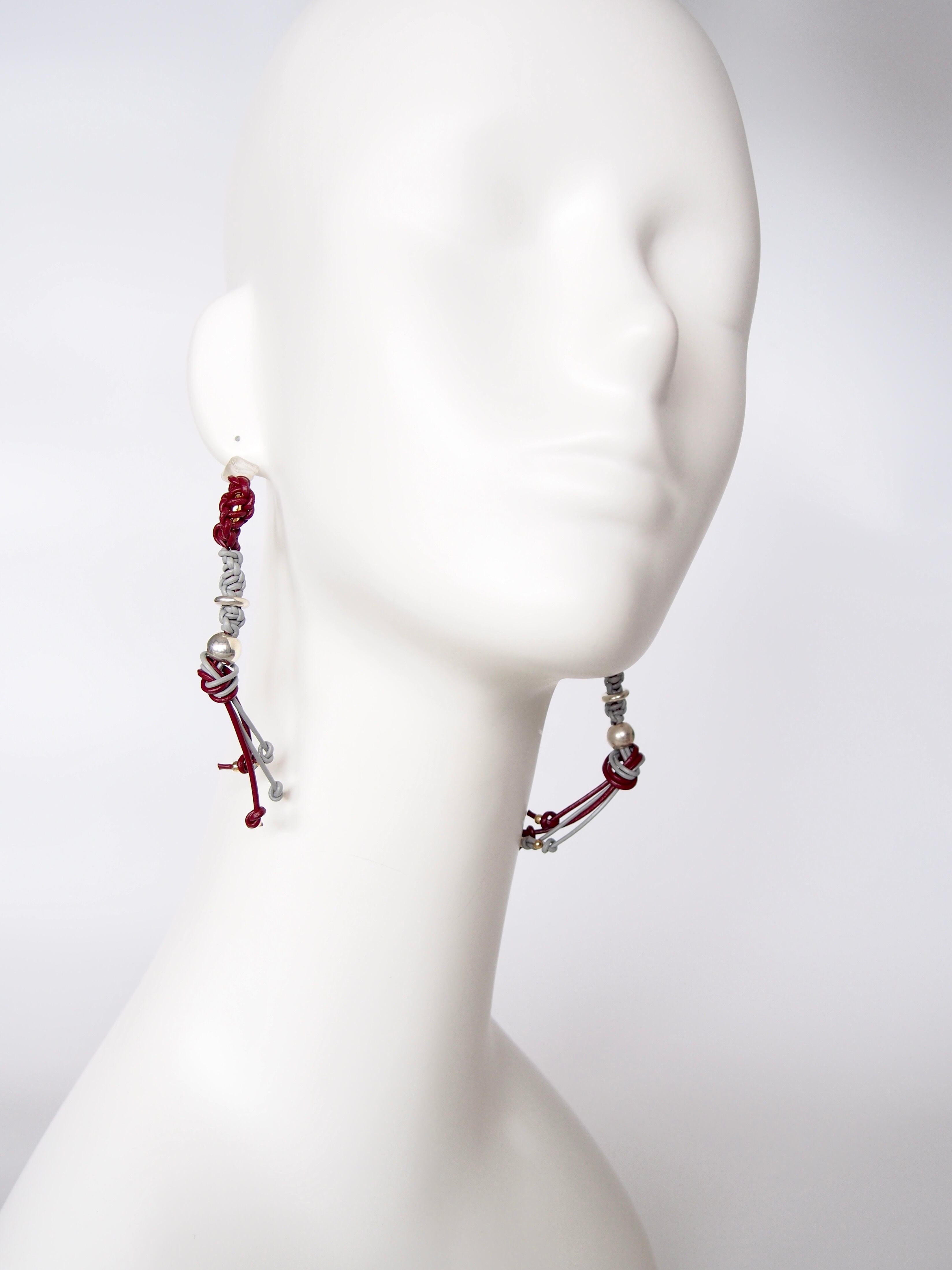 色の組み合わせで遊んだ、フープ形にカラーレザーの編み込みとノットのデザインが目新しい、