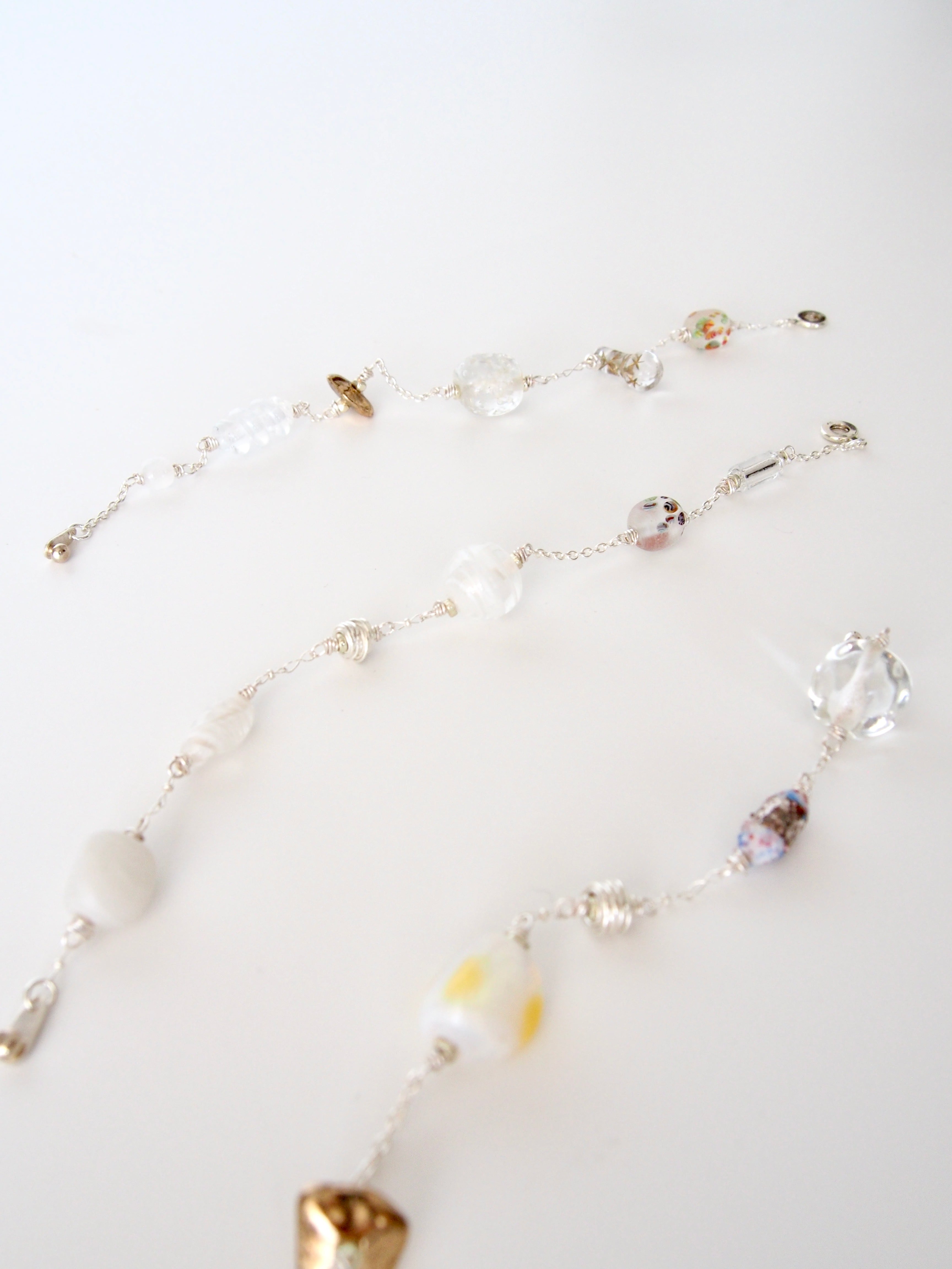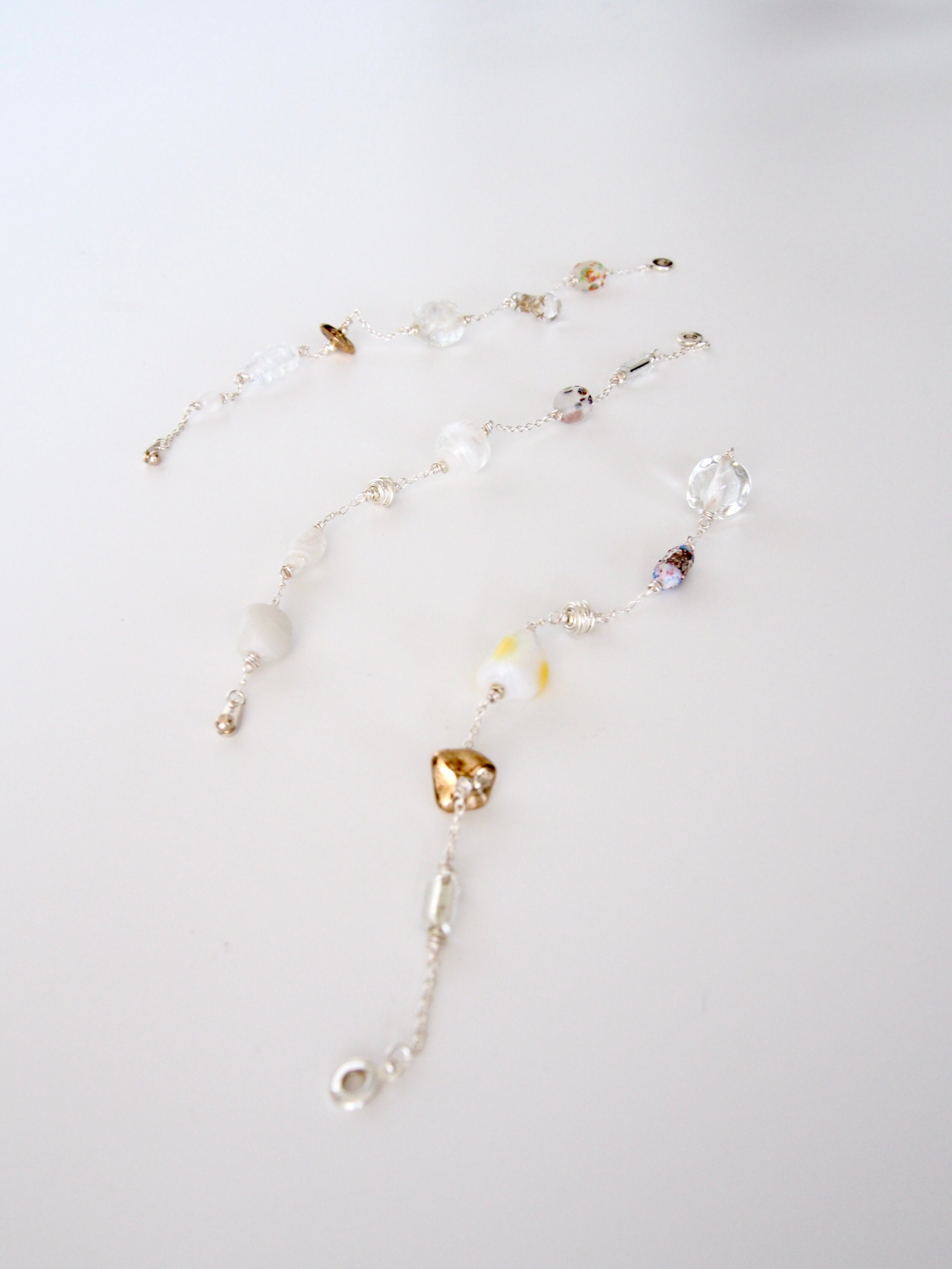 魅力的なガラスビーズとカレンシルバーパーツをシルバーチェーンにアソートに留めた、