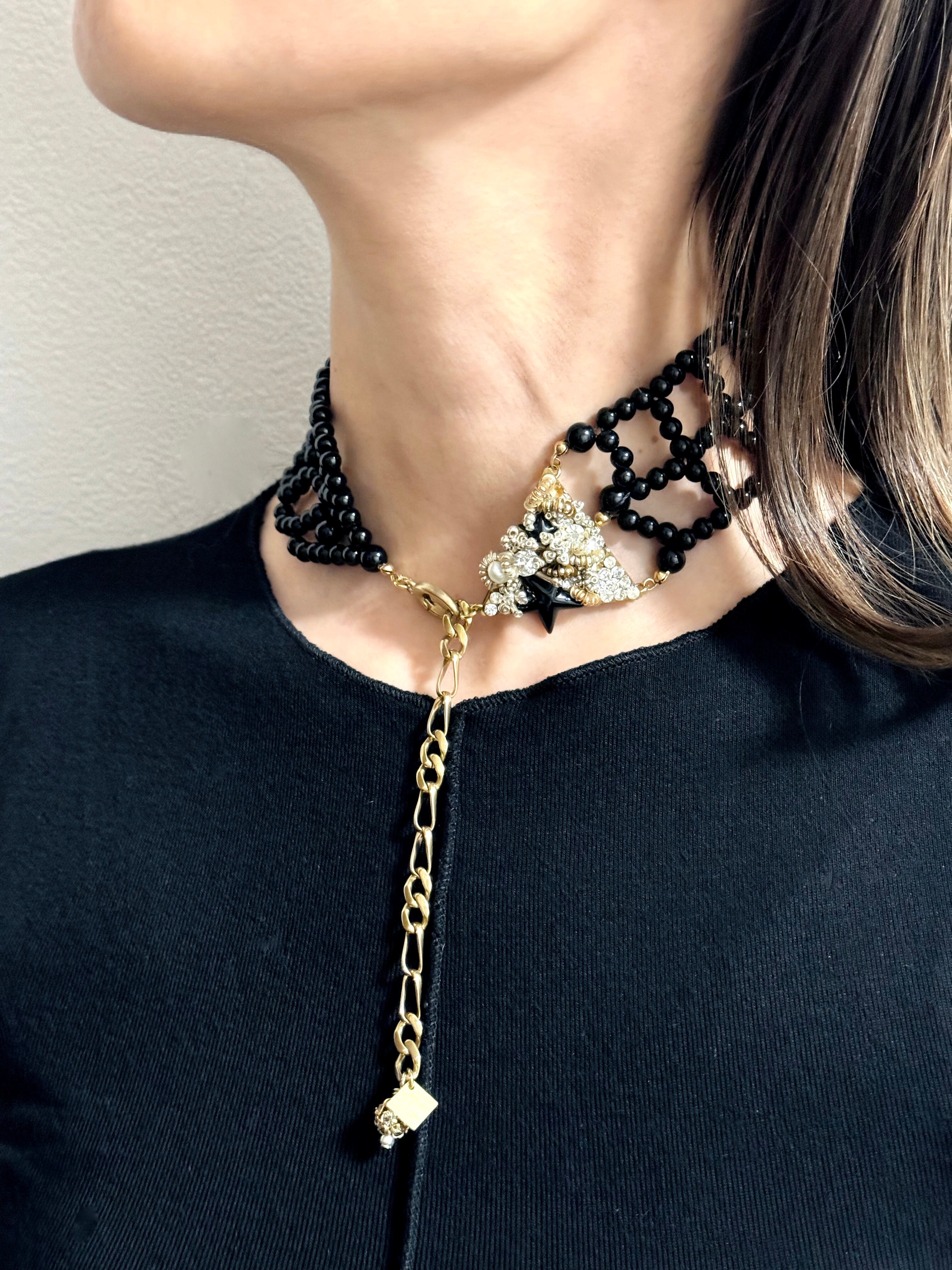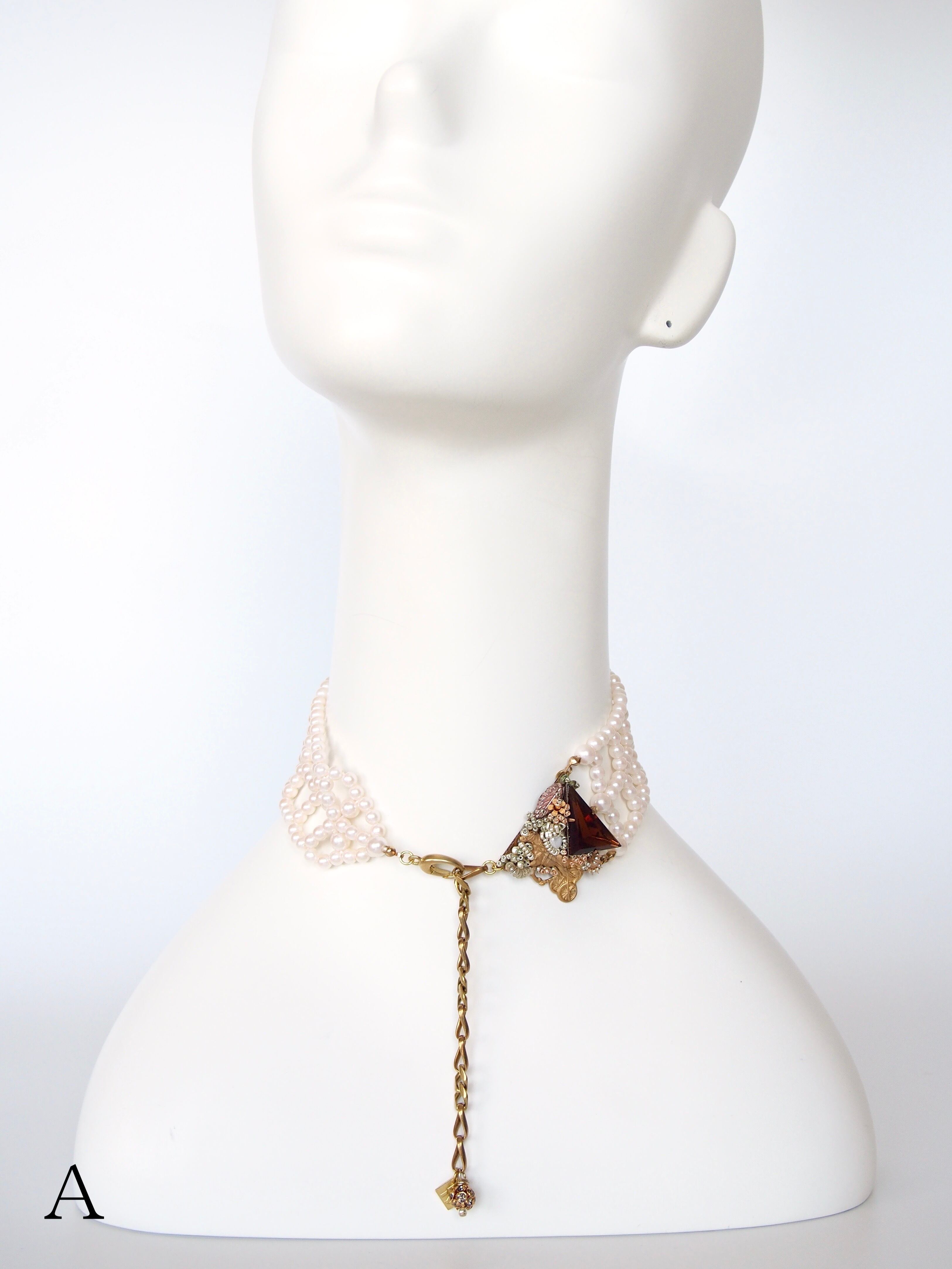 樹脂パールチョーカー(vintage)・真鍮(U.S.A vintage)・スタンピングパーツ(U.S.A)・ラインストーン(France vintage)・ガラスビーズ(Japan)・ガラスビーズ(Czech/ 1920's Czechslovakia)・ガラスカボション(Germany vintage)・スワロフスキー(Japan)・天然石・真鍮・アクリル樹脂