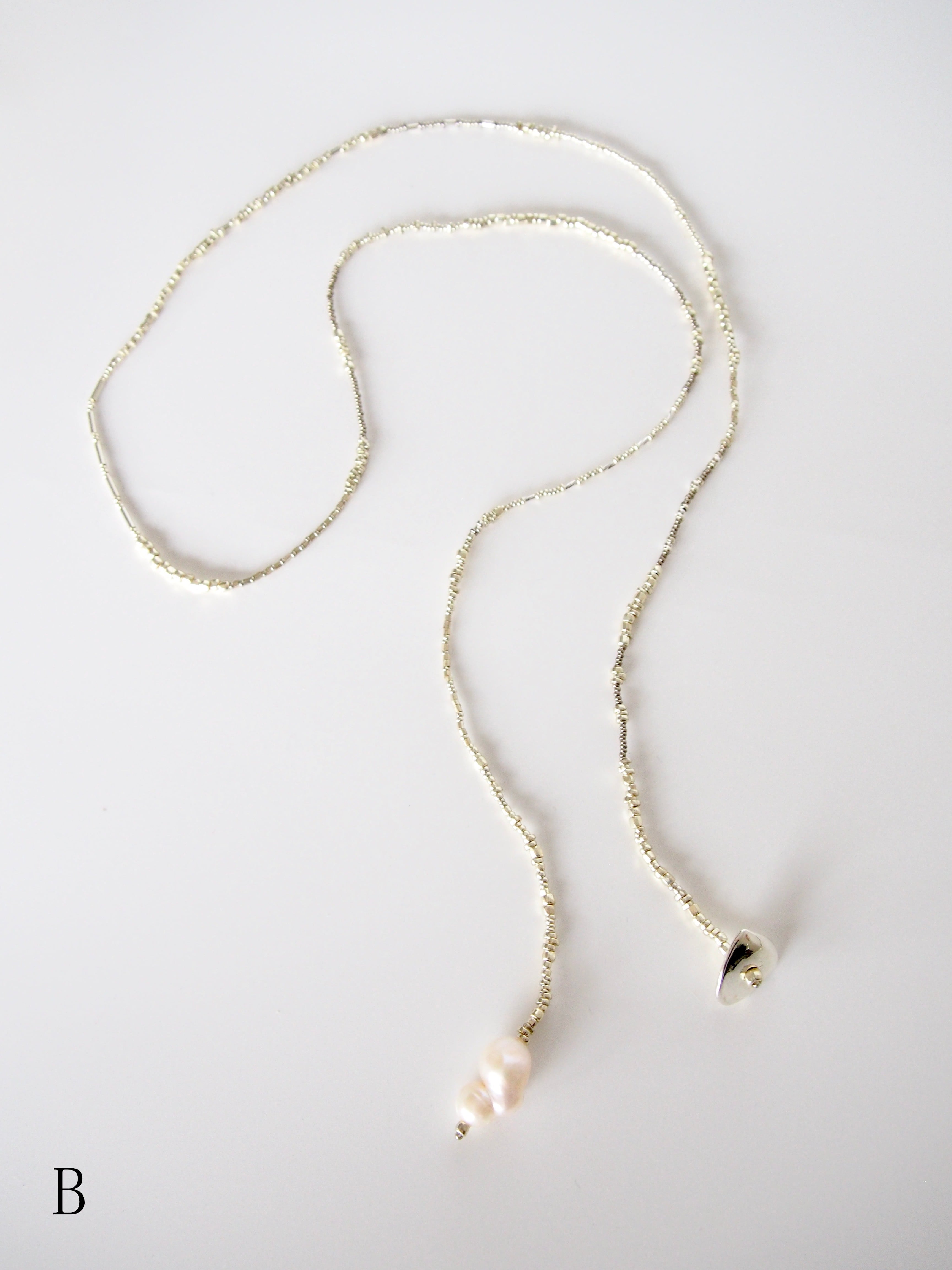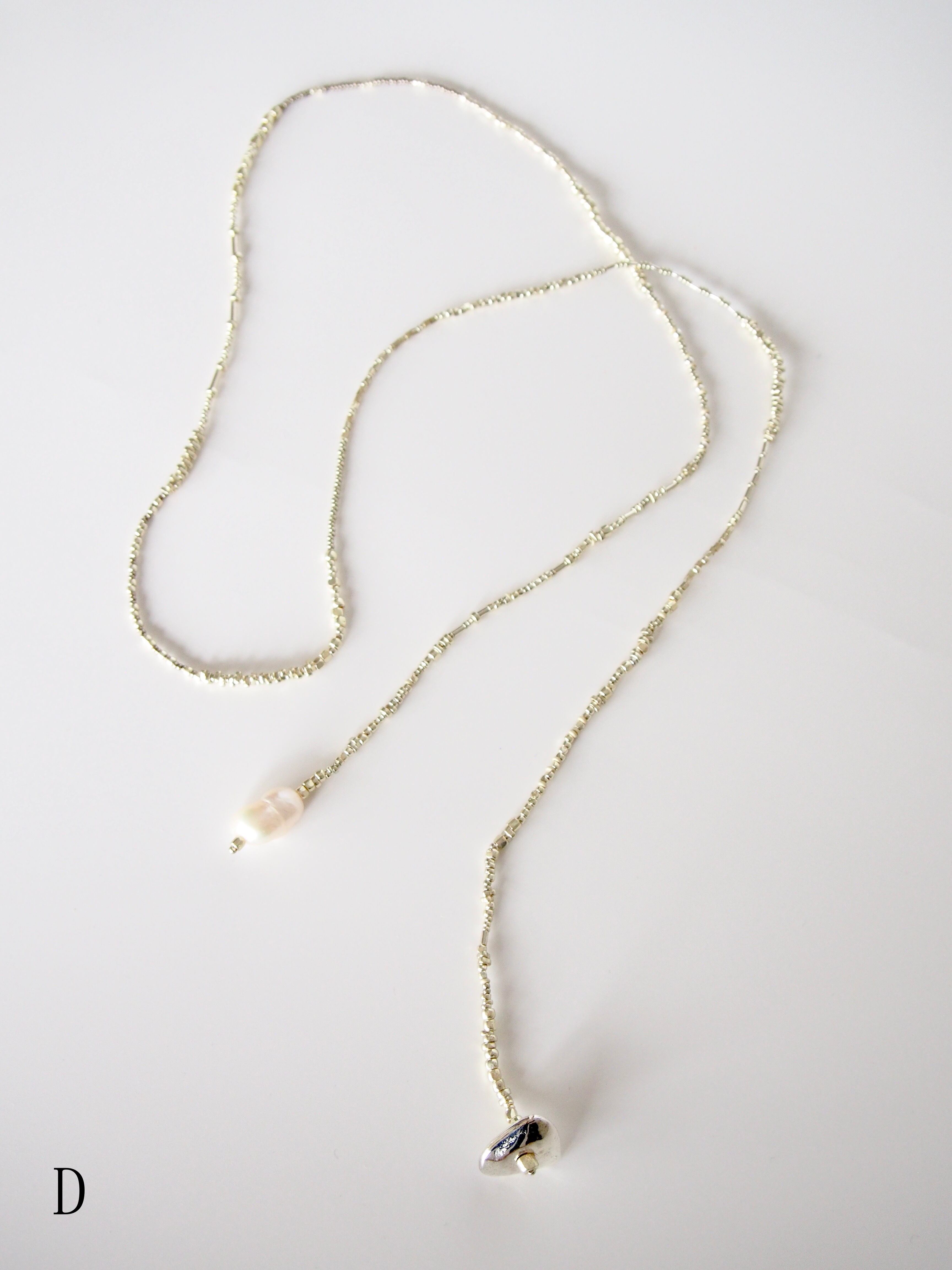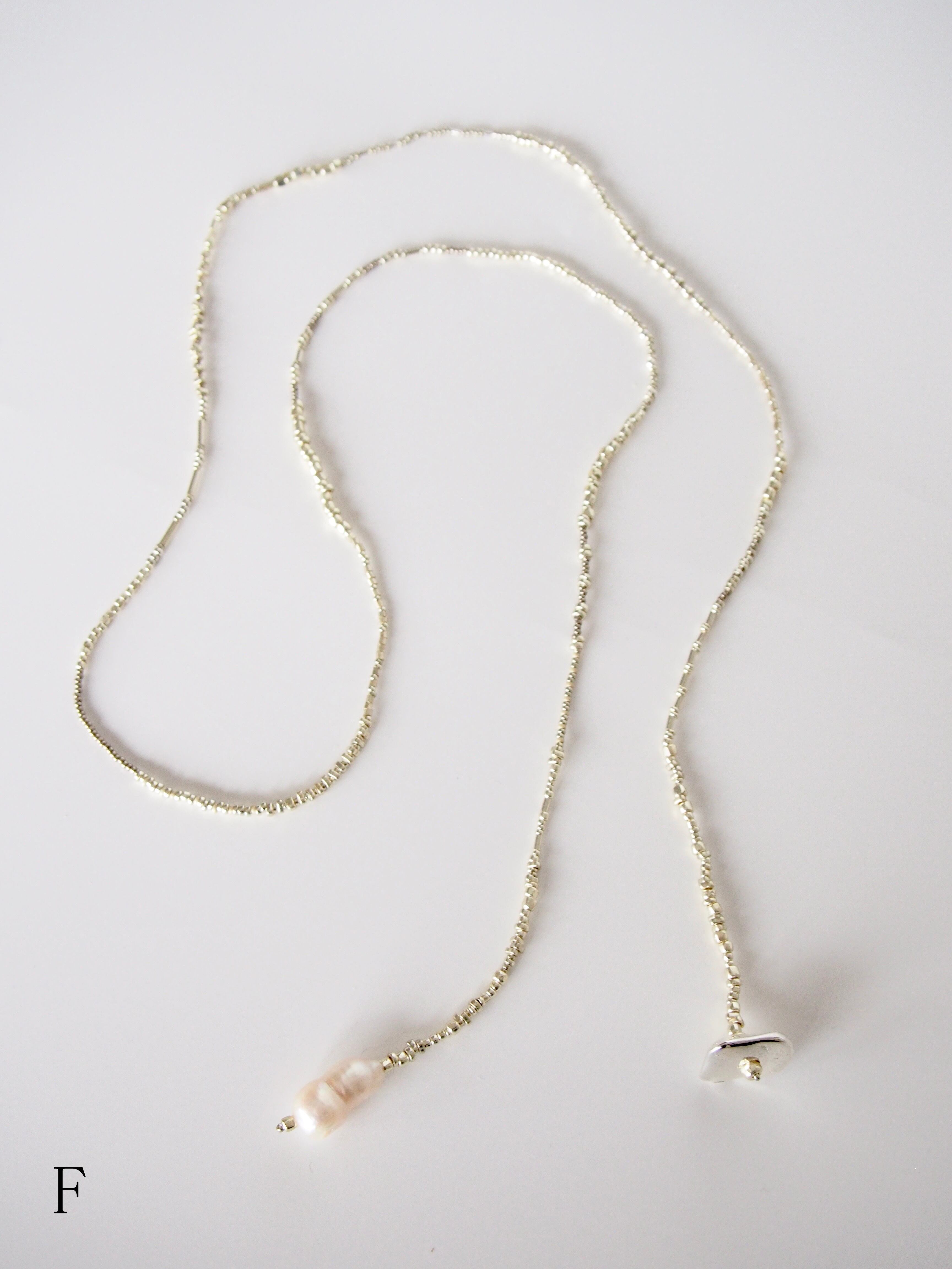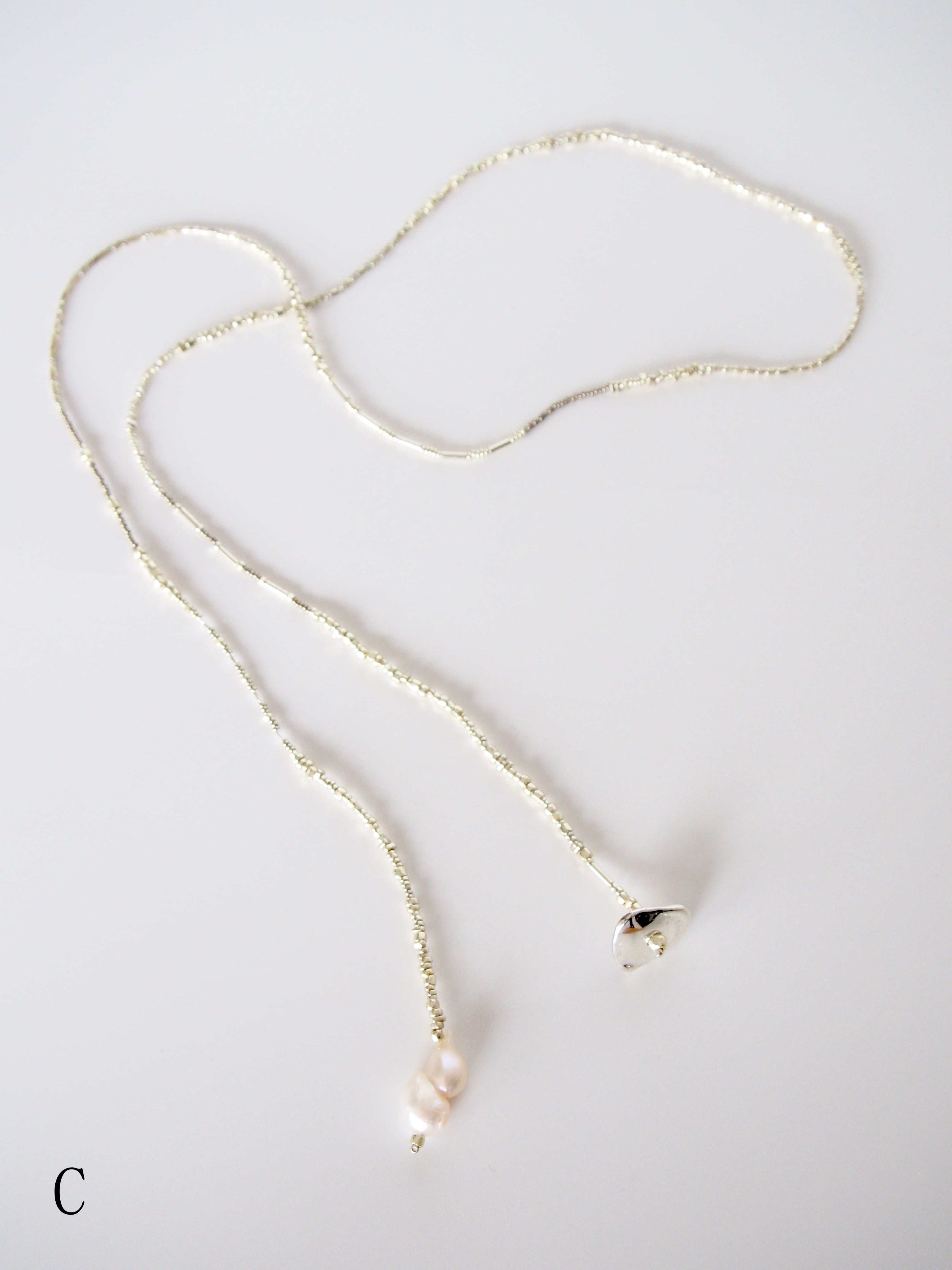 ネックレスに困る襟のあるデザインの装いや、シンプルすぎて困るTシャツなどに合わせるだけで特別な装いに。
