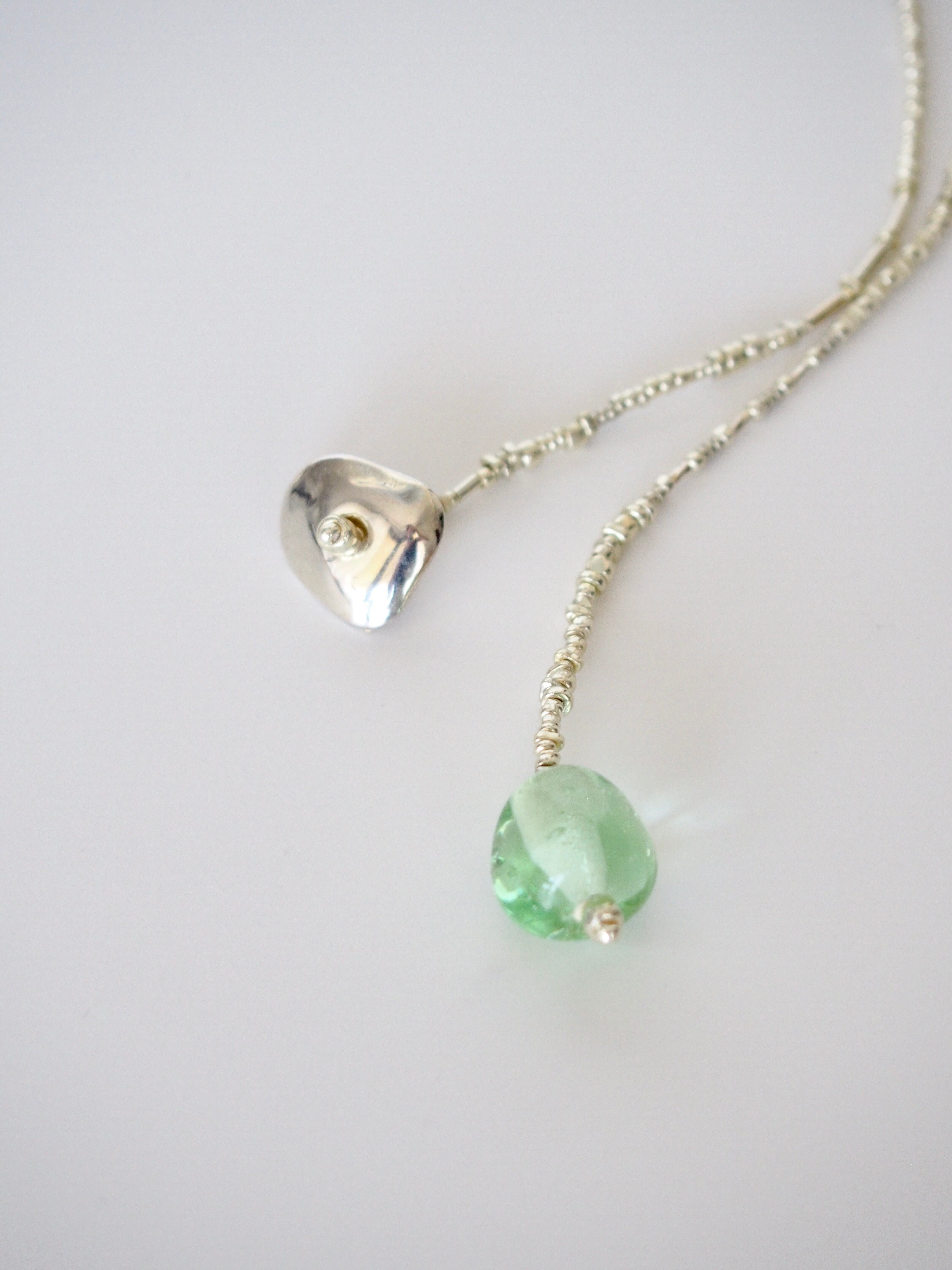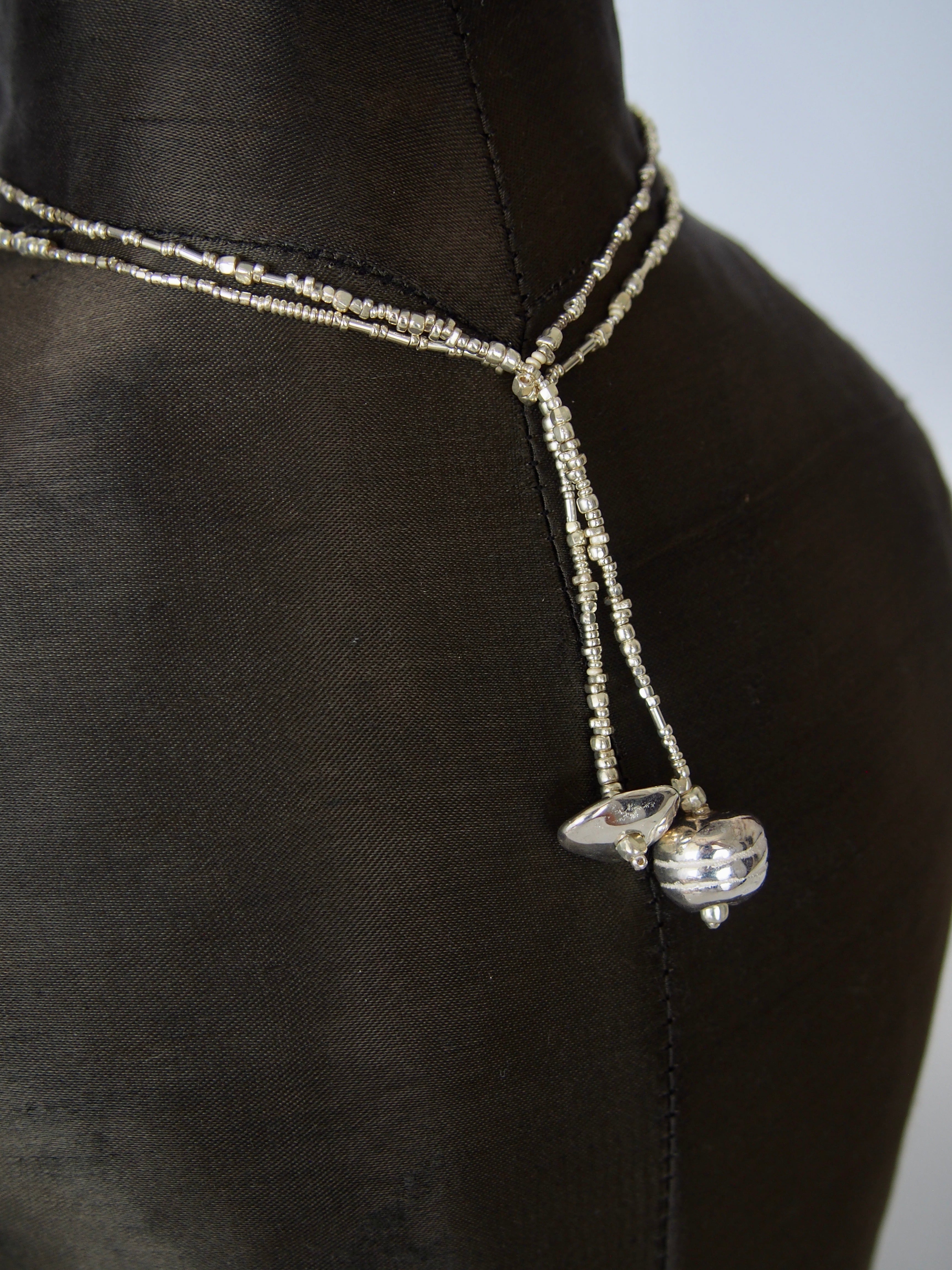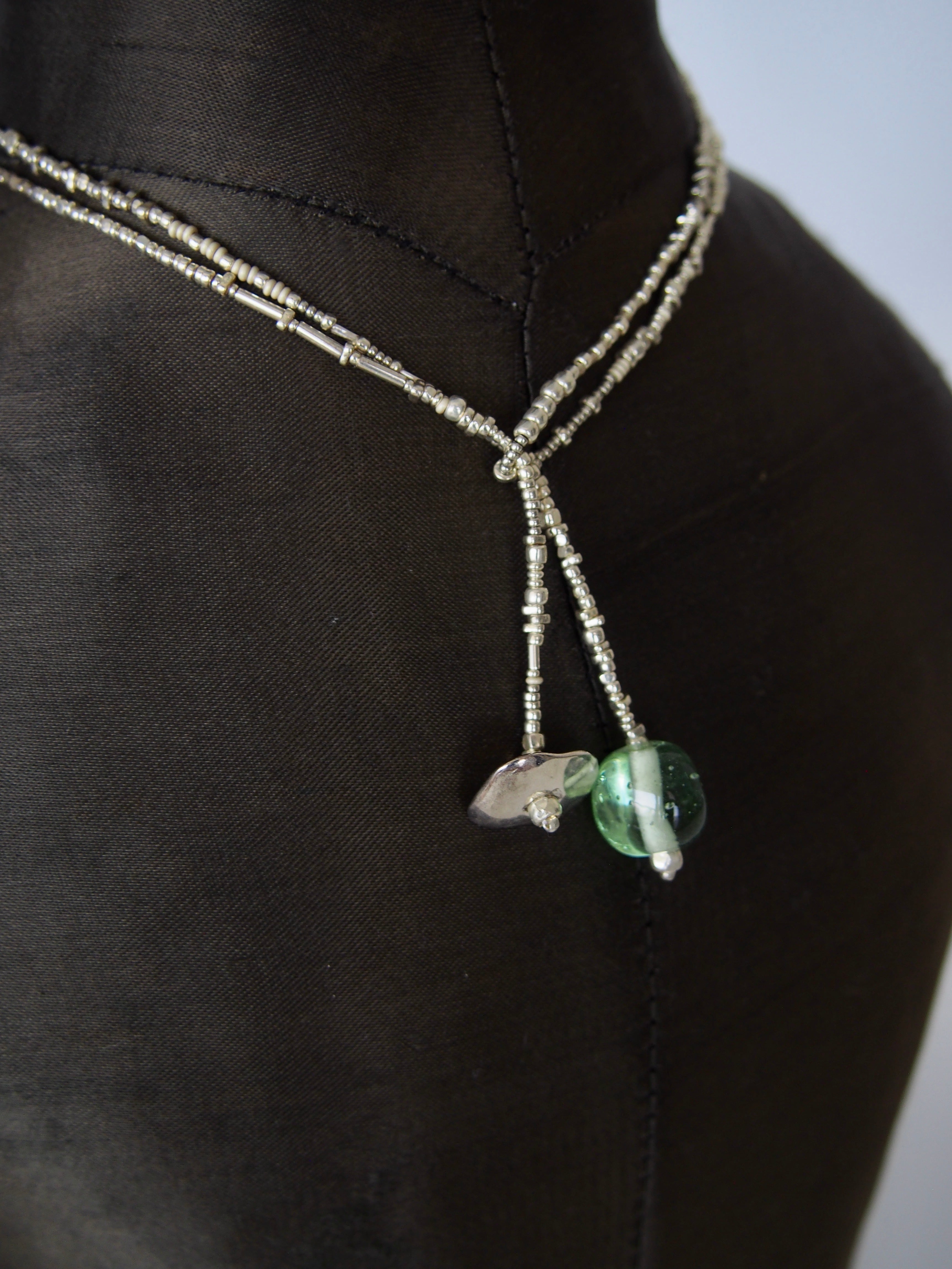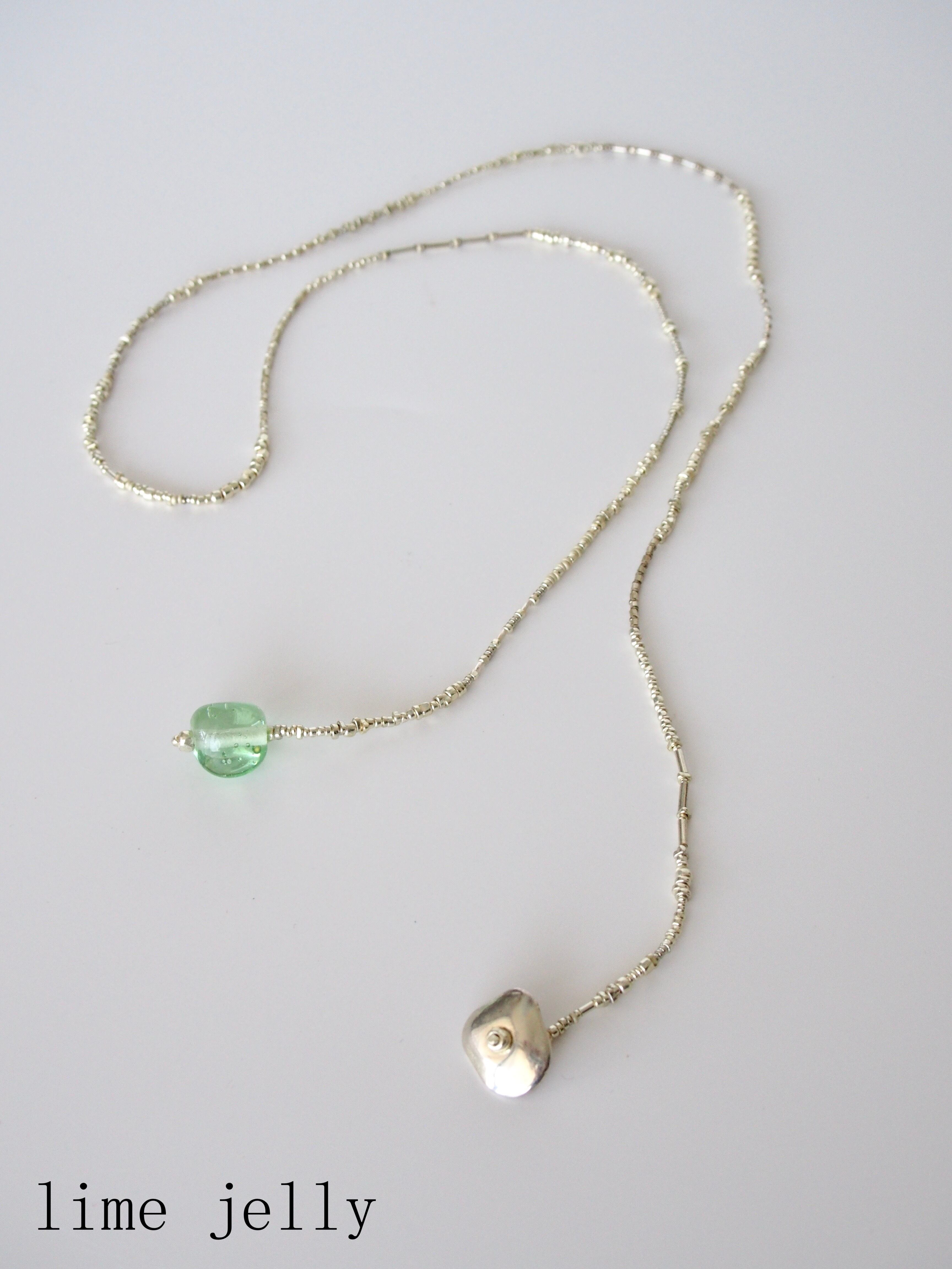 紐部分には、カレンシルバーや様々な形状のガラスビーズをランダムに配し、