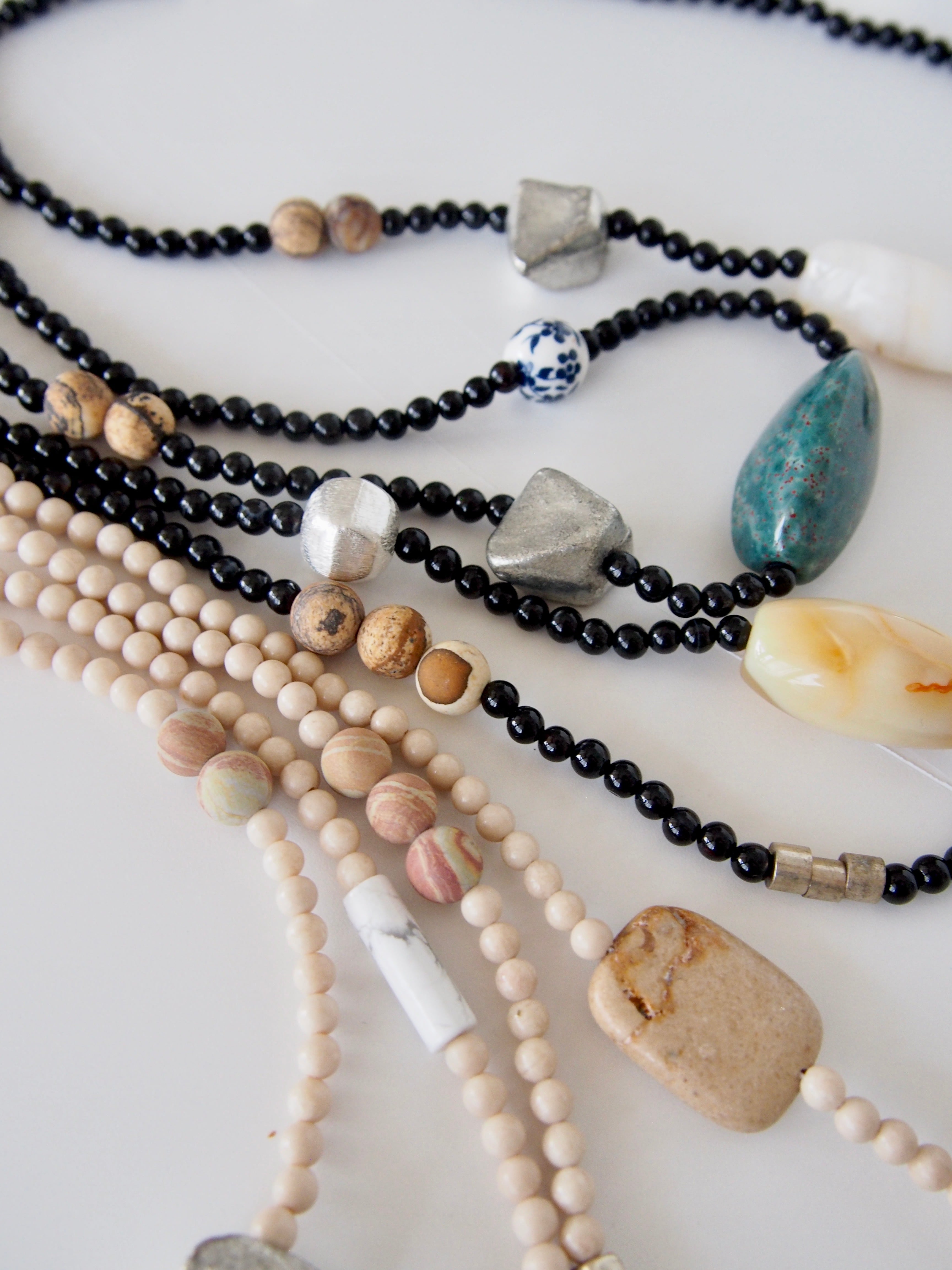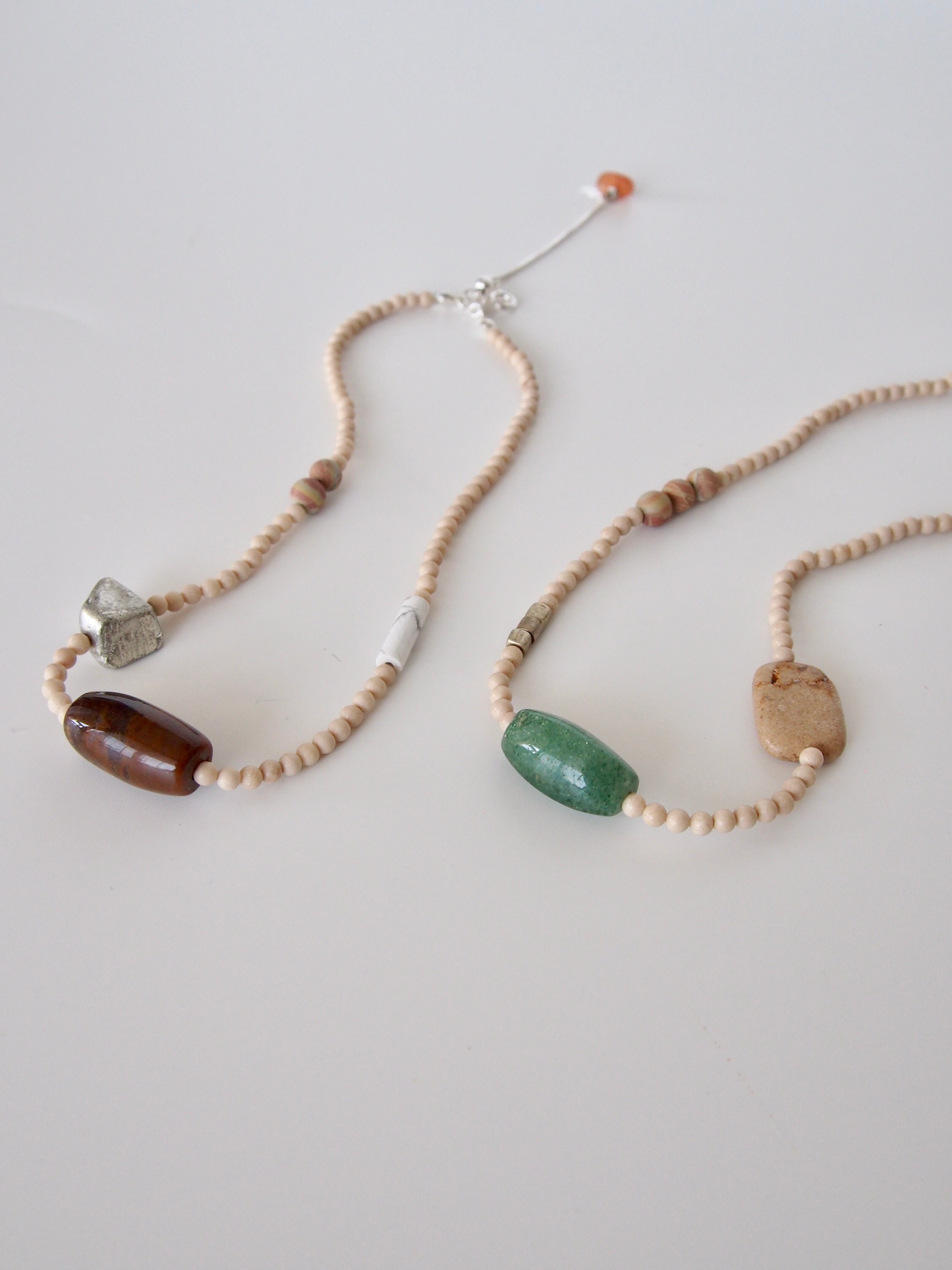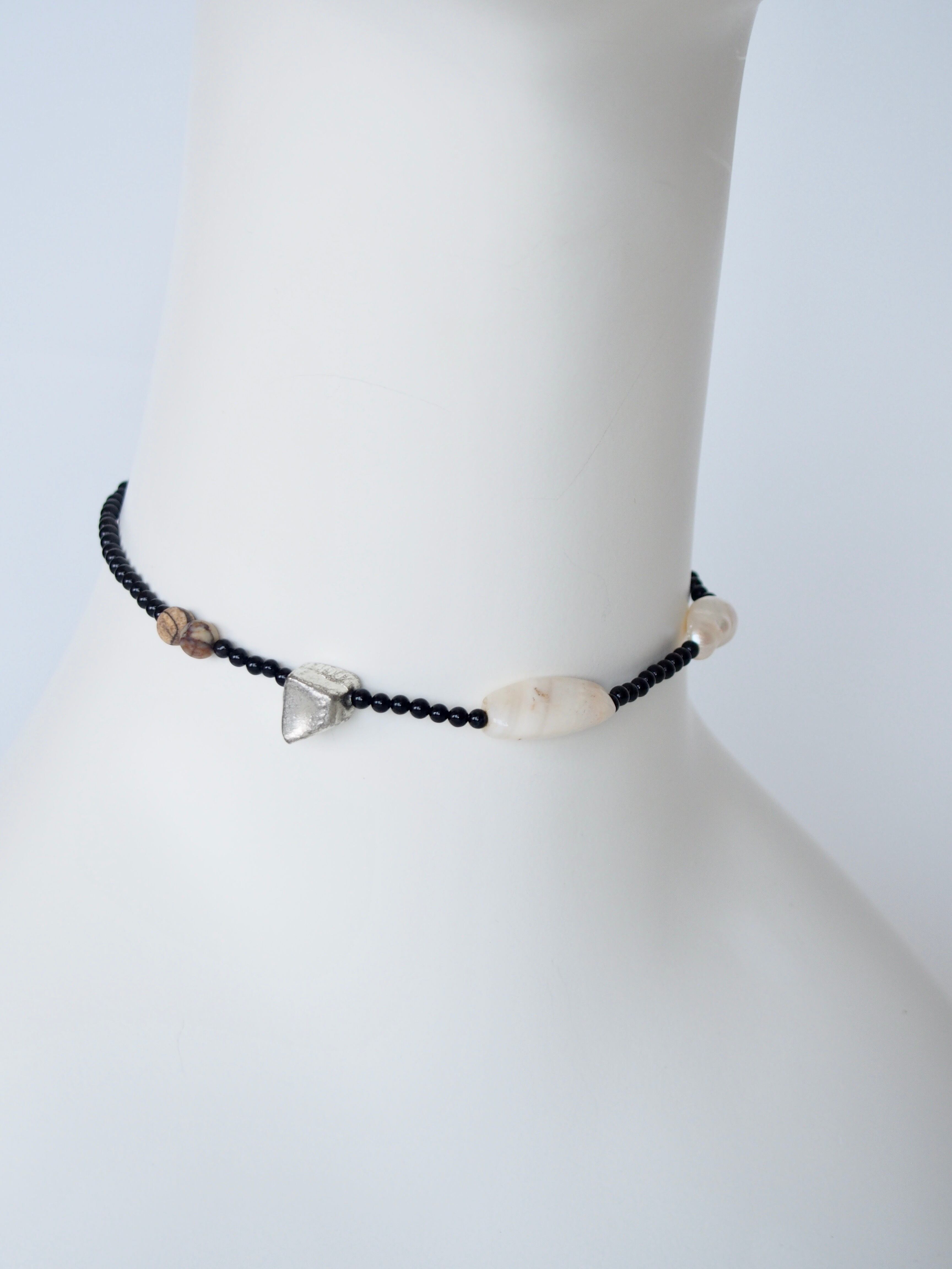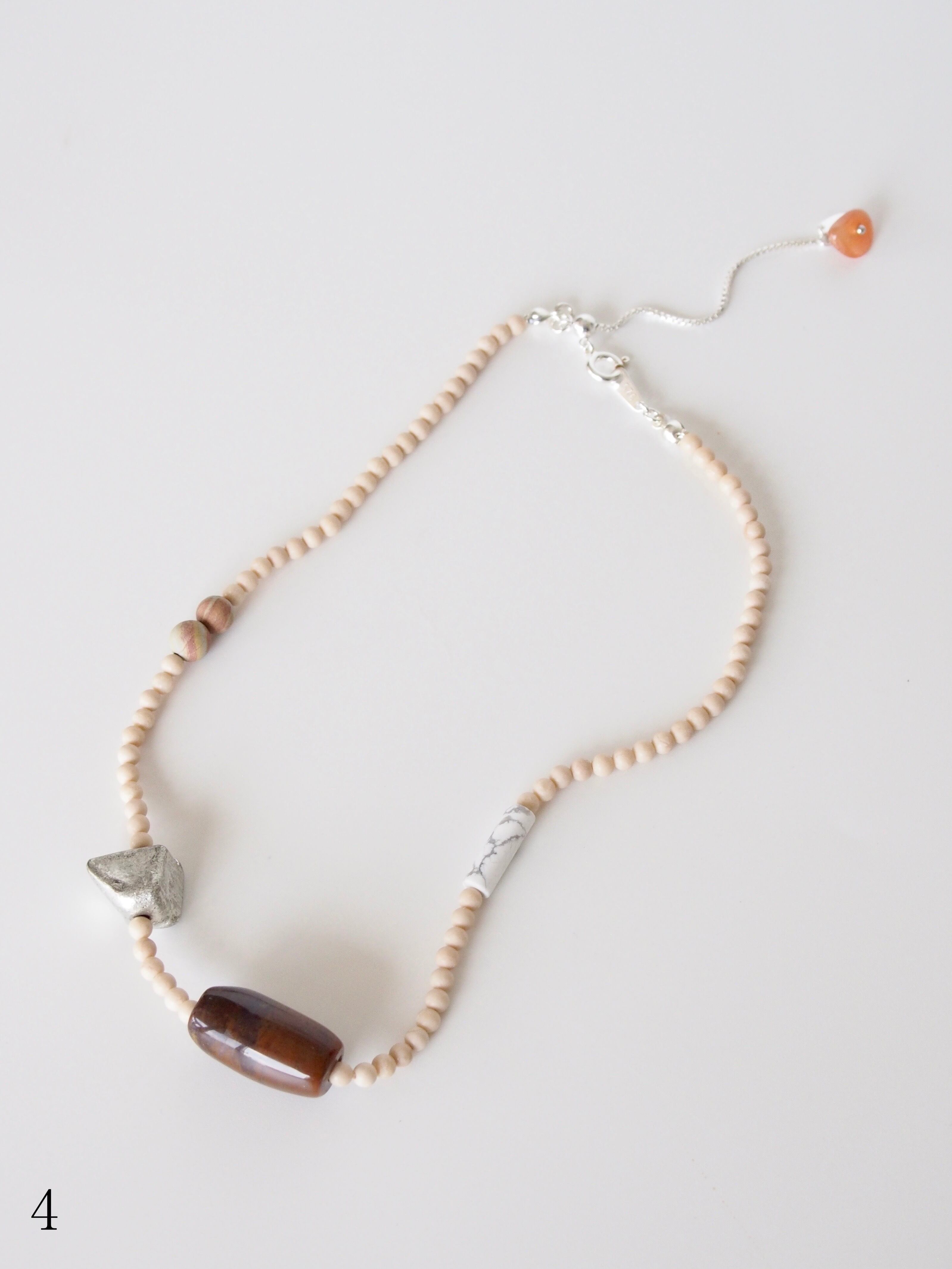 世界各地から仕入れた魅力的な4つの素材をバランスよくアソートに配置した一点物のチョーカーネックレス。
