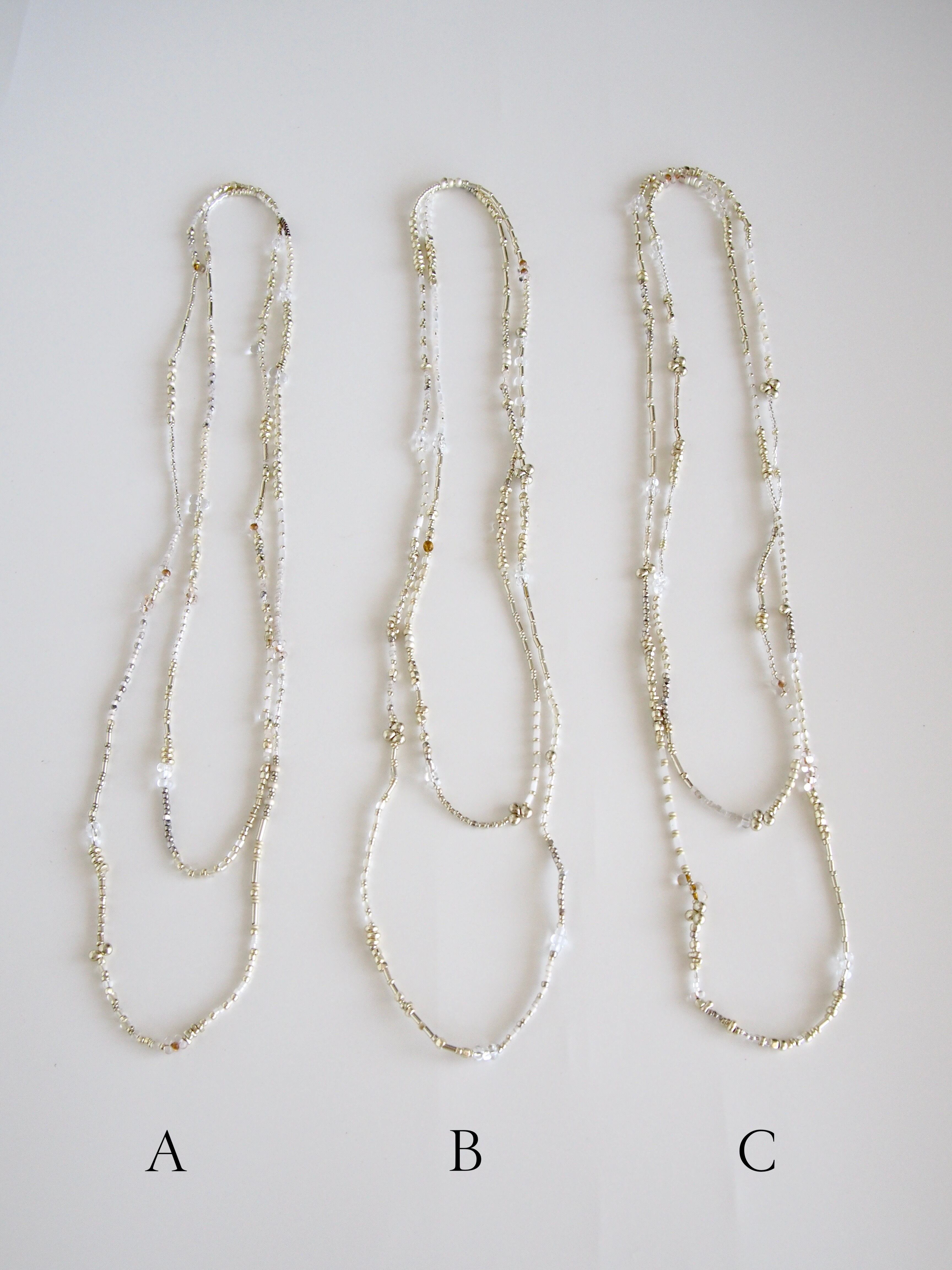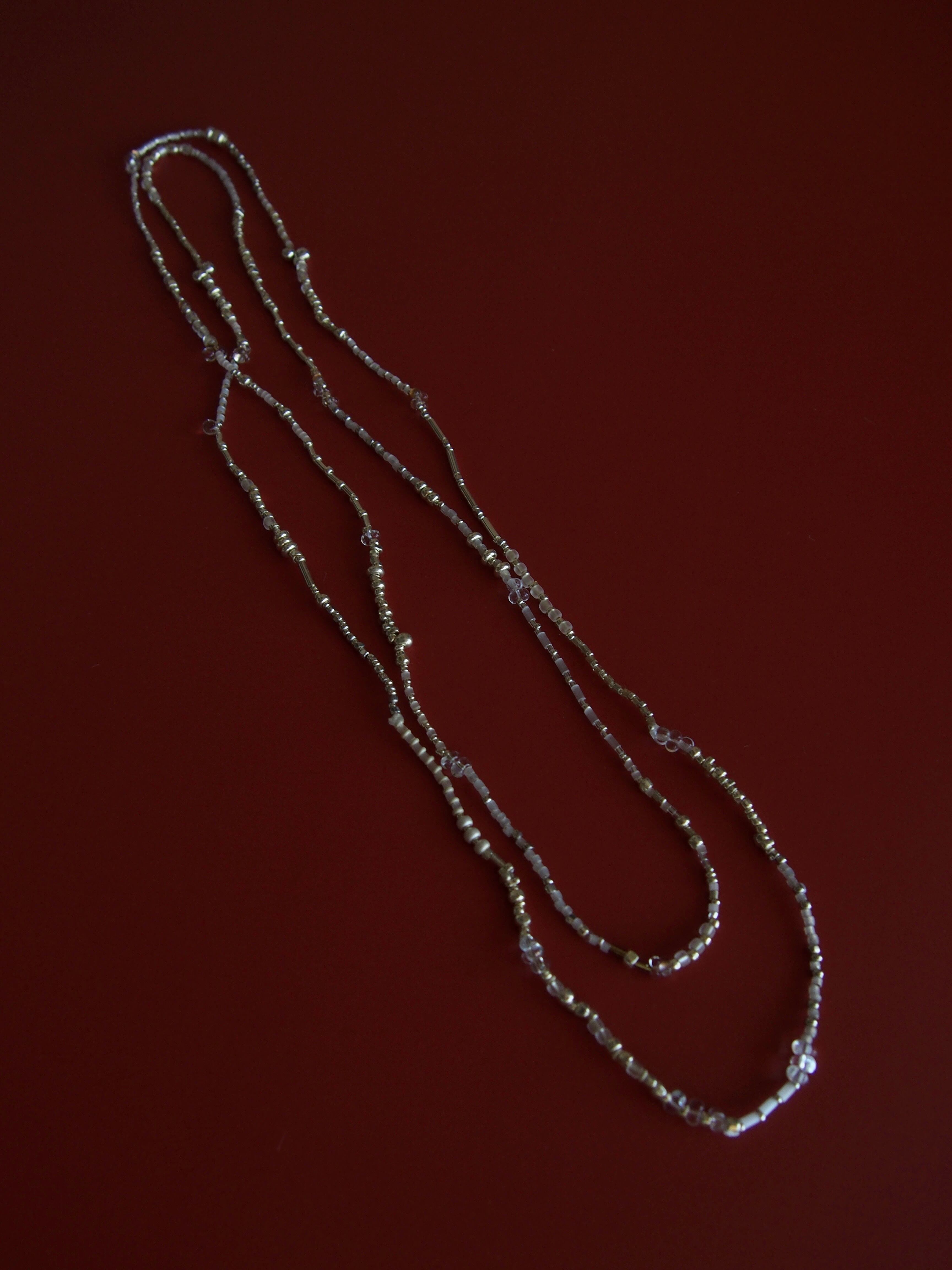 様々な表情の繊細なガラスビーズの暖かさを纏うシンプルな被るタイプのネックレス。